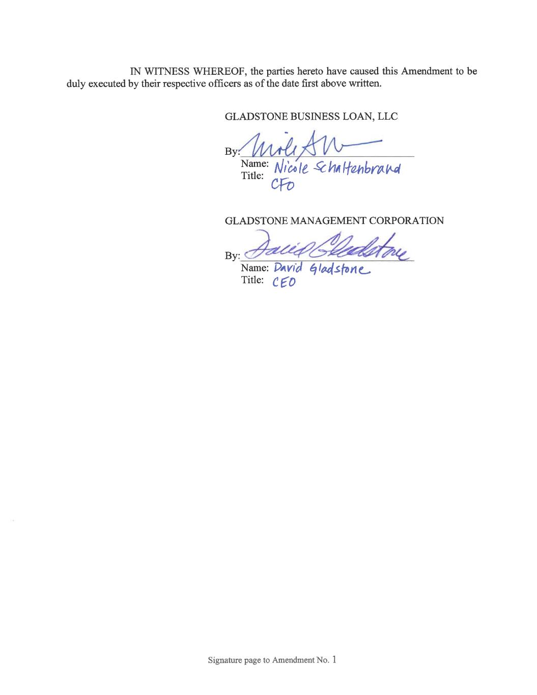 EXECUTION VERSION AMENDMENT NO. 1 THIS AMENDMENT NO. 1, (this “Amendment”) dated as of September 12, 2022, is entered into between GLADSTONE BUSINESS LOAN, LLC, as Borrower (the “Borrower”), GLADSTONE MANAGEMENT CORPORATION, as Servicer (the “Servicer”), and KEYBANK NATIONAL ASSOCIATION (“KeyBank”), as Administrative Agent (in such capacity, the “Administrative Agent”). Capitalized terms used but not otherwise defined herein shall have the meanings ascribed thereto in the “Credit Agreement” referred to below. RECITALS WHEREAS, the Borrower, the Servicer, the Lenders party thereto, the Managing Agents party thereto and the Administrative Agent are party to that certain Sixth Amended and Restated Credit Agreement dated as of May 13, 2021 by and among the Borrower, the Servicer, the Lenders, the Managing Agents and the Administrative Agent (as amended, modified, supplemented or otherwise modified prior to the date hereof, the “Credit Agreement”). WHEREAS, the Borrower and Administrative Agent are making an Early Opt-in Election and the Administrative Agent desires to amend the Credit Agreement to implement Benchmark Replacement Conforming Changes pursuant to the Early Opt-in Election set forth herein. NOW, THEREFORE, in consideration of the premises set forth above, and other good and valuable consideration the receipt and sufficiency of which is hereby acknowledged, the parties hereto agree as follows: SECTION 1. Amendments to the Credit Agreement. Upon satisfaction of the conditions precedent set forth in Section 3 hereof, the Credit Agreement is hereby amended as shown in the conformed copy thereof attached hereto as Exhibit A. In Exhibit A hereto, deletions of text in the Credit Agreement are indicated by struck-through text (indicated in the same manner as the following example: stricken text) and insertions of text are indicated by bold, double-underlined text (indicated in the same manner as the following example: double-underlined text) as set forth on Exhibit A hereto; SECTION 2. Representations and Warranties. The Borrower and the Servicer each hereby represents and warrants to each of the other parties hereto, that: (a) this Amendment constitutes its legal, valid and binding obligation, enforceable against it in accordance with its terms; and (b) on the date hereof, before and after giving effect to this Amendment, other than as waived pursuant to this Amendment, no Early Termination Event or Unmatured Termination Event has occurred and is continuing. SECTION 3. Conditions Precedent. This Amendment shall become effective on the sixth (6th) Business Day after the date hereof (which is the date notice of the Early Opt-in Election set forth herein is being provided to the Managing Agents and the Lenders), subject to the conditions precedent that: