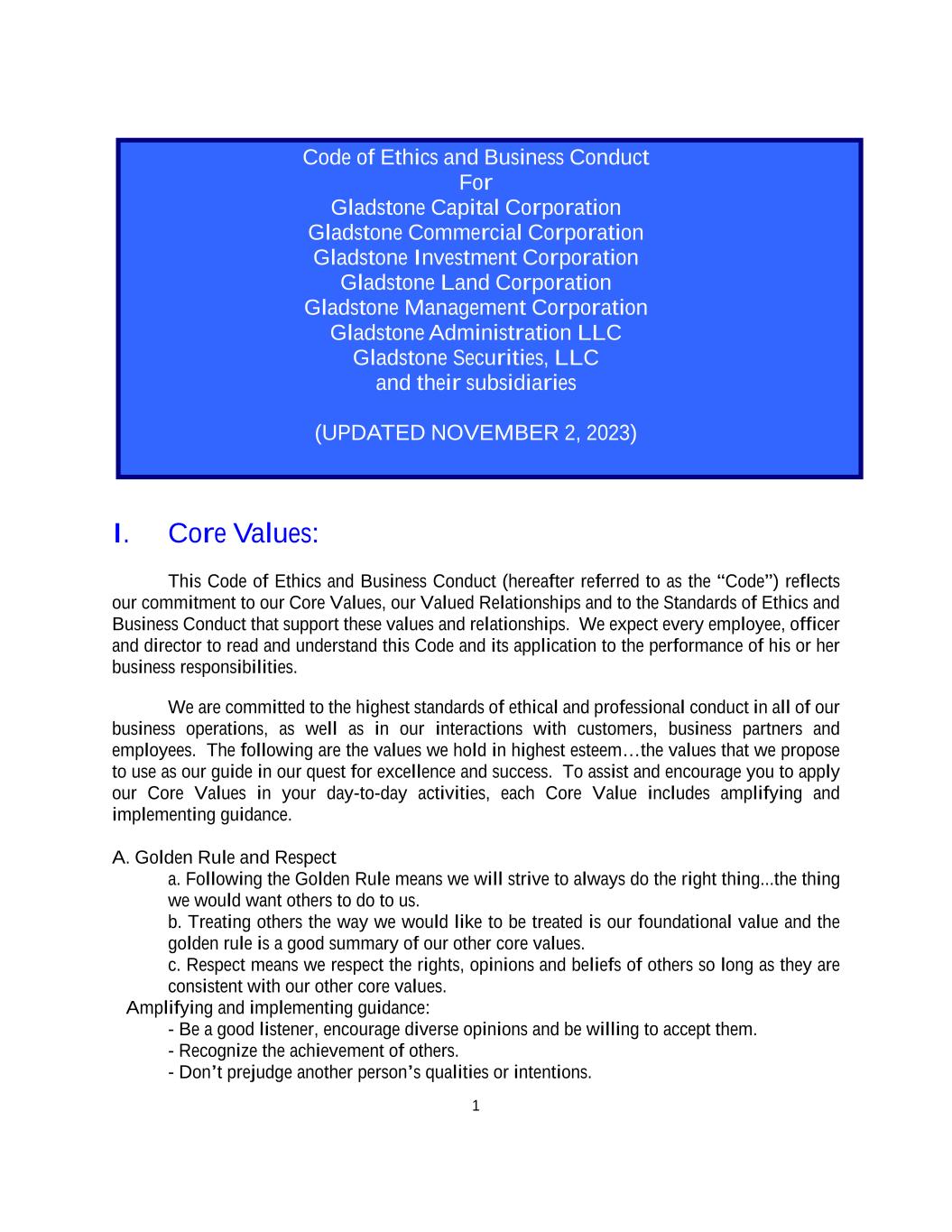 1 Code of Ethics and Business Conduct For Gladstone Capital Corporation Gladstone Commercial Corporation Gladstone Investment Corporation Gladstone Land Corporation Gladstone Management Corporation Gladstone Administration LLC Gladstone Securities, LLC and their subsidiaries (UPDATED NOVEMBER 2, 2023) I. Core Values: This Code of Ethics and Business Conduct (hereafter referred to as the “Code”) reflects our commitment to our Core Values, our Valued Relationships and to the Standards of Ethics and Business Conduct that support these values and relationships. We expect every employee, officer and director to read and understand this Code and its application to the performance of his or her business responsibilities. We are committed to the highest standards of ethical and professional conduct in all of our business operations, as well as in our interactions with customers, business partners and employees. The following are the values we hold in highest esteem…the values that we propose to use as our guide in our quest for excellence and success. To assist and encourage you to apply our Core Values in your day-to-day activities, each Core Value includes amplifying and implementing guidance. A. Golden Rule and Respect a. Following the Golden Rule means we will strive to always do the right thing...the thing we would want others to do to us. b. Treating others the way we would like to be treated is our foundational value and the golden rule is a good summary of our other core values. c. Respect means we respect the rights, opinions and beliefs of others so long as they are consistent with our other core values. Amplifying and implementing guidance: - Be a good listener, encourage diverse opinions and be willing to accept them. - Recognize the achievement of others. - Don’t prejudge another person’s qualities or intentions.