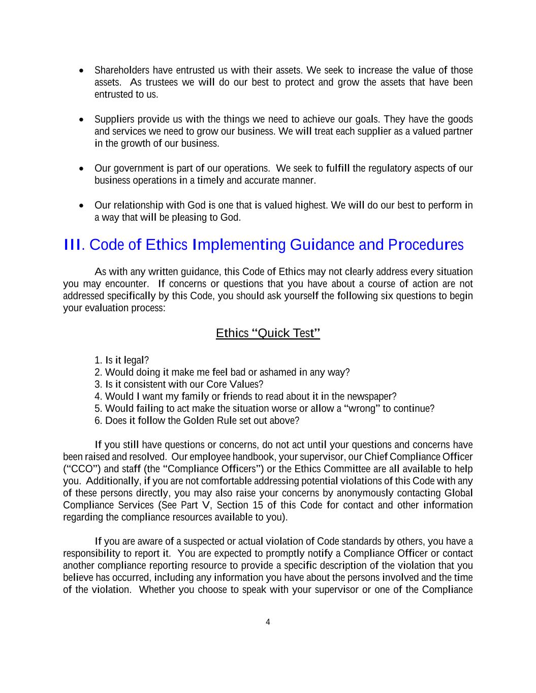 4 • Shareholders have entrusted us with their assets. We seek to increase the value of those assets. As trustees we will do our best to protect and grow the assets that have been entrusted to us. • Suppliers provide us with the things we need to achieve our goals. They have the goods and services we need to grow our business. We will treat each supplier as a valued partner in the growth of our business. • Our government is part of our operations. We seek to fulfill the regulatory aspects of our business operations in a timely and accurate manner. • Our relationship with God is one that is valued highest. We will do our best to perform in a way that will be pleasing to God. III. Code of Ethics Implementing Guidance and Procedures As with any written guidance, this Code of Ethics may not clearly address every situation you may encounter. If concerns or questions that you have about a course of action are not addressed specifically by this Code, you should ask yourself the following six questions to begin your evaluation process: Ethics “Quick Test” 1. Is it legal? 2. Would doing it make me feel bad or ashamed in any way? 3. Is it consistent with our Core Values? 4. Would I want my family or friends to read about it in the newspaper? 5. Would failing to act make the situation worse or allow a “wrong” to continue? 6. Does it follow the Golden Rule set out above? If you still have questions or concerns, do not act until your questions and concerns have been raised and resolved. Our employee handbook, your supervisor, our Chief Compliance Officer (“CCO”) and staff (the “Compliance Officers”) or the Ethics Committee are all available to help you. Additionally, if you are not comfortable addressing potential violations of this Code with any of these persons directly, you may also raise your concerns by anonymously contacting Global Compliance Services (See Part V, Section 15 of this Code for contact and other information regarding the compliance resources available to you). If you are aware of a suspected or actual violation of Code standards by others, you have a responsibility to report it. You are expected to promptly notify a Compliance Officer or contact another compliance reporting resource to provide a specific description of the violation that you believe has occurred, including any information you have about the persons involved and the time of the violation. Whether you choose to speak with your supervisor or one of the Compliance