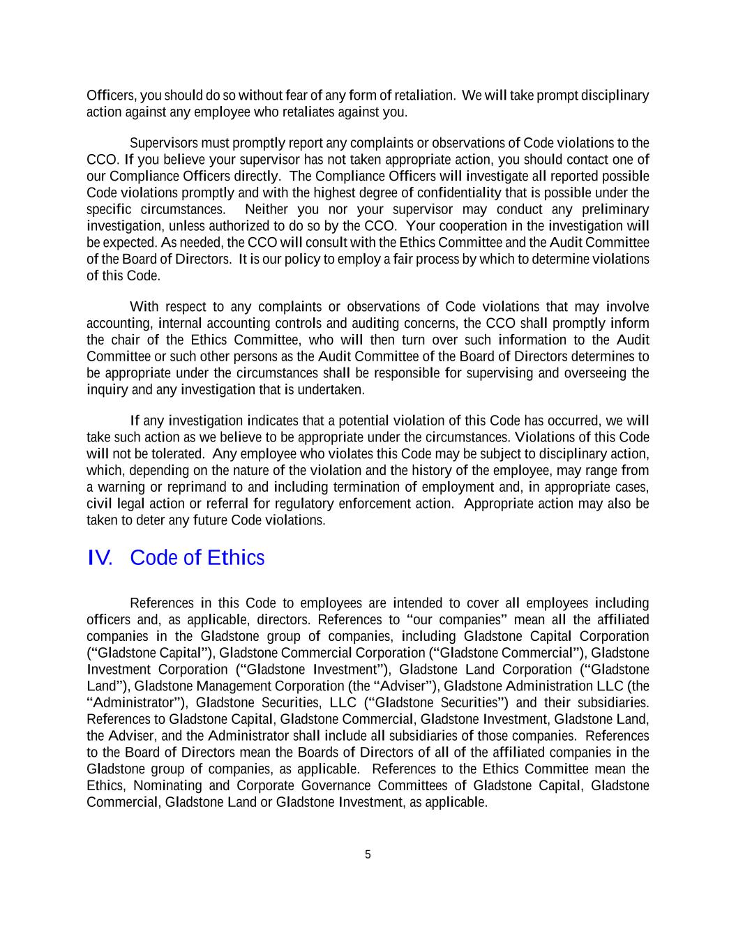 5 Officers, you should do so without fear of any form of retaliation. We will take prompt disciplinary action against any employee who retaliates against you. Supervisors must promptly report any complaints or observations of Code violations to the CCO. If you believe your supervisor has not taken appropriate action, you should contact one of our Compliance Officers directly. The Compliance Officers will investigate all reported possible Code violations promptly and with the highest degree of confidentiality that is possible under the specific circumstances. Neither you nor your supervisor may conduct any preliminary investigation, unless authorized to do so by the CCO. Your cooperation in the investigation will be expected. As needed, the CCO will consult with the Ethics Committee and the Audit Committee of the Board of Directors. It is our policy to employ a fair process by which to determine violations of this Code. With respect to any complaints or observations of Code violations that may involve accounting, internal accounting controls and auditing concerns, the CCO shall promptly inform the chair of the Ethics Committee, who will then turn over such information to the Audit Committee or such other persons as the Audit Committee of the Board of Directors determines to be appropriate under the circumstances shall be responsible for supervising and overseeing the inquiry and any investigation that is undertaken. If any investigation indicates that a potential violation of this Code has occurred, we will take such action as we believe to be appropriate under the circumstances. Violations of this Code will not be tolerated. Any employee who violates this Code may be subject to disciplinary action, which, depending on the nature of the violation and the history of the employee, may range from a warning or reprimand to and including termination of employment and, in appropriate cases, civil legal action or referral for regulatory enforcement action. Appropriate action may also be taken to deter any future Code violations. IV. Code of Ethics References in this Code to employees are intended to cover all employees including officers and, as applicable, directors. References to “our companies” mean all the affiliated companies in the Gladstone group of companies, including Gladstone Capital Corporation (“Gladstone Capital”), Gladstone Commercial Corporation (“Gladstone Commercial”), Gladstone Investment Corporation (“Gladstone Investment”), Gladstone Land Corporation (“Gladstone Land”), Gladstone Management Corporation (the “Adviser”), Gladstone Administration LLC (the “Administrator”), Gladstone Securities, LLC (“Gladstone Securities”) and their subsidiaries. References to Gladstone Capital, Gladstone Commercial, Gladstone Investment, Gladstone Land, the Adviser, and the Administrator shall include all subsidiaries of those companies. References to the Board of Directors mean the Boards of Directors of all of the affiliated companies in the Gladstone group of companies, as applicable. References to the Ethics Committee mean the Ethics, Nominating and Corporate Governance Committees of Gladstone Capital, Gladstone Commercial, Gladstone Land or Gladstone Investment, as applicable.