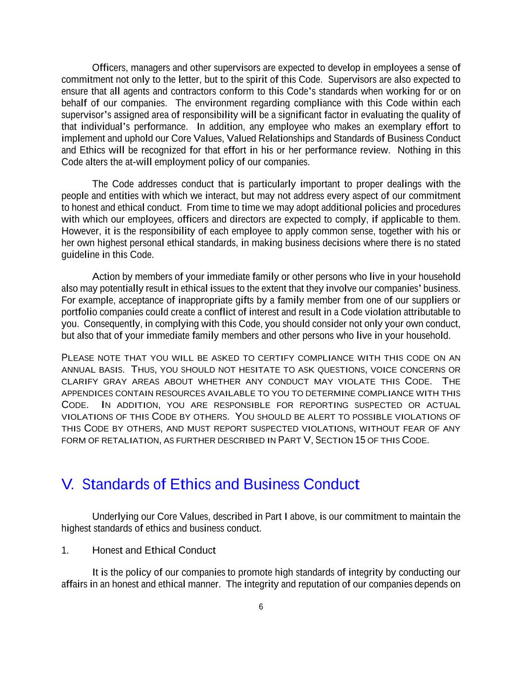 6 Officers, managers and other supervisors are expected to develop in employees a sense of commitment not only to the letter, but to the spirit of this Code. Supervisors are also expected to ensure that all agents and contractors conform to this Code’s standards when working for or on behalf of our companies. The environment regarding compliance with this Code within each supervisor’s assigned area of responsibility will be a significant factor in evaluating the quality of that individual’s performance. In addition, any employee who makes an exemplary effort to implement and uphold our Core Values, Valued Relationships and Standards of Business Conduct and Ethics will be recognized for that effort in his or her performance review. Nothing in this Code alters the at-will employment policy of our companies. The Code addresses conduct that is particularly important to proper dealings with the people and entities with which we interact, but may not address every aspect of our commitment to honest and ethical conduct. From time to time we may adopt additional policies and procedures with which our employees, officers and directors are expected to comply, if applicable to them. However, it is the responsibility of each employee to apply common sense, together with his or her own highest personal ethical standards, in making business decisions where there is no stated guideline in this Code. Action by members of your immediate family or other persons who live in your household also may potentially result in ethical issues to the extent that they involve our companies’ business. For example, acceptance of inappropriate gifts by a family member from one of our suppliers or portfolio companies could create a conflict of interest and result in a Code violation attributable to you. Consequently, in complying with this Code, you should consider not only your own conduct, but also that of your immediate family members and other persons who live in your household. PLEASE NOTE THAT YOU WILL BE ASKED TO CERTIFY COMPLIANCE WITH THIS CODE ON AN ANNUAL BASIS. THUS, YOU SHOULD NOT HESITATE TO ASK QUESTIONS, VOICE CONCERNS OR CLARIFY GRAY AREAS ABOUT WHETHER ANY CONDUCT MAY VIOLATE THIS CODE. THE APPENDICES CONTAIN RESOURCES AVAILABLE TO YOU TO DETERMINE COMPLIANCE WITH THIS CODE. IN ADDITION, YOU ARE RESPONSIBLE FOR REPORTING SUSPECTED OR ACTUAL VIOLATIONS OF THIS CODE BY OTHERS. YOU SHOULD BE ALERT TO POSSIBLE VIOLATIONS OF THIS CODE BY OTHERS, AND MUST REPORT SUSPECTED VIOLATIONS, WITHOUT FEAR OF ANY FORM OF RETALIATION, AS FURTHER DESCRIBED IN PART V, SECTION 15 OF THIS CODE. V. Standards of Ethics and Business Conduct Underlying our Core Values, described in Part I above, is our commitment to maintain the highest standards of ethics and business conduct. 1. Honest and Ethical Conduct It is the policy of our companies to promote high standards of integrity by conducting our affairs in an honest and ethical manner. The integrity and reputation of our companies depends on