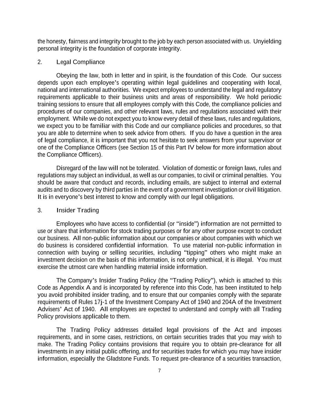 7 the honesty, fairness and integrity brought to the job by each person associated with us. Unyielding personal integrity is the foundation of corporate integrity. 2. Legal Compliance Obeying the law, both in letter and in spirit, is the foundation of this Code. Our success depends upon each employee’s operating within legal guidelines and cooperating with local, national and international authorities. We expect employees to understand the legal and regulatory requirements applicable to their business units and areas of responsibility. We hold periodic training sessions to ensure that all employees comply with this Code, the compliance policies and procedures of our companies, and other relevant laws, rules and regulations associated with their employment. While we do not expect you to know every detail of these laws, rules and regulations, we expect you to be familiar with this Code and our compliance policies and procedures, so that you are able to determine when to seek advice from others. If you do have a question in the area of legal compliance, it is important that you not hesitate to seek answers from your supervisor or one of the Compliance Officers (see Section 15 of this Part IV below for more information about the Compliance Officers). Disregard of the law will not be tolerated. Violation of domestic or foreign laws, rules and regulations may subject an individual, as well as our companies, to civil or criminal penalties. You should be aware that conduct and records, including emails, are subject to internal and external audits and to discovery by third parties in the event of a government investigation or civil litigation. It is in everyone’s best interest to know and comply with our legal obligations. 3. Insider Trading Employees who have access to confidential (or “inside”) information are not permitted to use or share that information for stock trading purposes or for any other purpose except to conduct our business. All non-public information about our companies or about companies with which we do business is considered confidential information. To use material non-public information in connection with buying or selling securities, including “tipping” others who might make an investment decision on the basis of this information, is not only unethical, it is illegal. You must exercise the utmost care when handling material inside information. The Company’s Insider Trading Policy (the “Trading Policy”), which is attached to this Code as Appendix A and is incorporated by reference into this Code, has been instituted to help you avoid prohibited insider trading, and to ensure that our companies comply with the separate requirements of Rules 17j-1 of the Investment Company Act of 1940 and 204A of the Investment Advisers’ Act of 1940. All employees are expected to understand and comply with all Trading Policy provisions applicable to them. The Trading Policy addresses detailed legal provisions of the Act and imposes requirements, and in some cases, restrictions, on certain securities trades that you may wish to make. The Trading Policy contains provisions that require you to obtain pre-clearance for all investments in any initial public offering, and for securities trades for which you may have insider information, especially the Gladstone Funds. To request pre-clearance of a securities transaction,