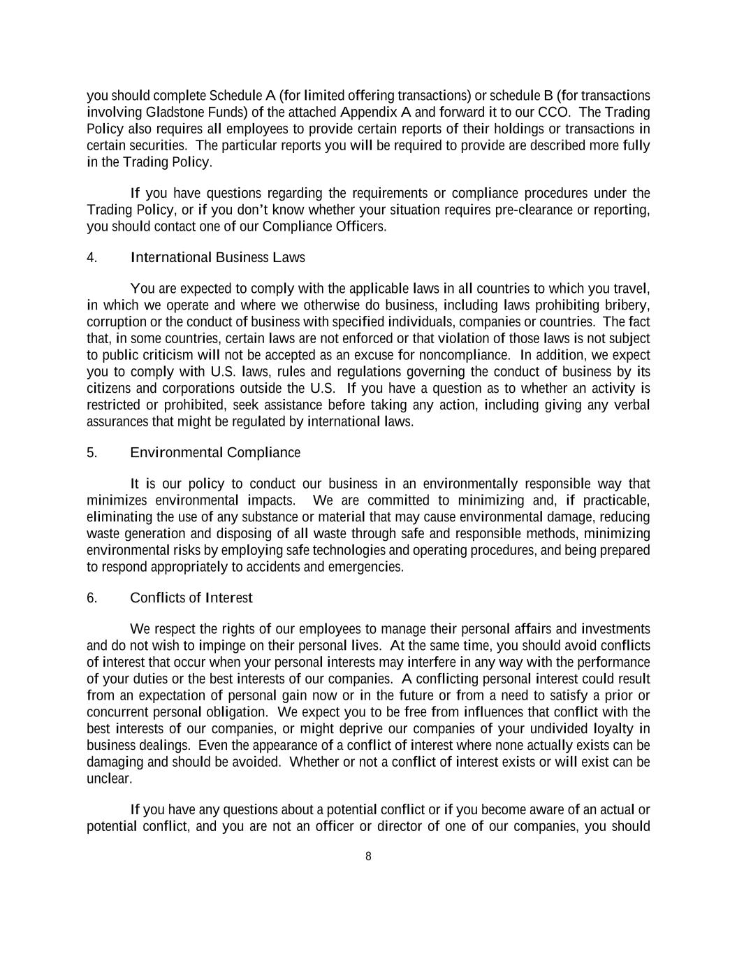 8 you should complete Schedule A (for limited offering transactions) or schedule B (for transactions involving Gladstone Funds) of the attached Appendix A and forward it to our CCO. The Trading Policy also requires all employees to provide certain reports of their holdings or transactions in certain securities. The particular reports you will be required to provide are described more fully in the Trading Policy. If you have questions regarding the requirements or compliance procedures under the Trading Policy, or if you don’t know whether your situation requires pre-clearance or reporting, you should contact one of our Compliance Officers. 4. International Business Laws You are expected to comply with the applicable laws in all countries to which you travel, in which we operate and where we otherwise do business, including laws prohibiting bribery, corruption or the conduct of business with specified individuals, companies or countries. The fact that, in some countries, certain laws are not enforced or that violation of those laws is not subject to public criticism will not be accepted as an excuse for noncompliance. In addition, we expect you to comply with U.S. laws, rules and regulations governing the conduct of business by its citizens and corporations outside the U.S. If you have a question as to whether an activity is restricted or prohibited, seek assistance before taking any action, including giving any verbal assurances that might be regulated by international laws. 5. Environmental Compliance It is our policy to conduct our business in an environmentally responsible way that minimizes environmental impacts. We are committed to minimizing and, if practicable, eliminating the use of any substance or material that may cause environmental damage, reducing waste generation and disposing of all waste through safe and responsible methods, minimizing environmental risks by employing safe technologies and operating procedures, and being prepared to respond appropriately to accidents and emergencies. 6. Conflicts of Interest We respect the rights of our employees to manage their personal affairs and investments and do not wish to impinge on their personal lives. At the same time, you should avoid conflicts of interest that occur when your personal interests may interfere in any way with the performance of your duties or the best interests of our companies. A conflicting personal interest could result from an expectation of personal gain now or in the future or from a need to satisfy a prior or concurrent personal obligation. We expect you to be free from influences that conflict with the best interests of our companies, or might deprive our companies of your undivided loyalty in business dealings. Even the appearance of a conflict of interest where none actually exists can be damaging and should be avoided. Whether or not a conflict of interest exists or will exist can be unclear. If you have any questions about a potential conflict or if you become aware of an actual or potential conflict, and you are not an officer or director of one of our companies, you should