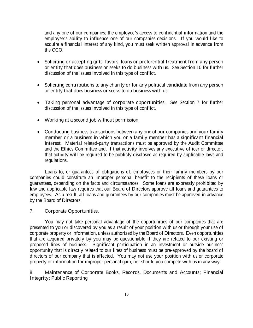 10 and any one of our companies; the employee’s access to confidential information and the employee’s ability to influence one of our companies decisions. If you would like to acquire a financial interest of any kind, you must seek written approval in advance from the CCO. • Soliciting or accepting gifts, favors, loans or preferential treatment from any person or entity that does business or seeks to do business with us. See Section 10 for further discussion of the issues involved in this type of conflict. • Soliciting contributions to any charity or for any political candidate from any person or entity that does business or seeks to do business with us. • Taking personal advantage of corporate opportunities. See Section 7 for further discussion of the issues involved in this type of conflict. • Working at a second job without permission. • Conducting business transactions between any one of our companies and your family member or a business in which you or a family member has a significant financial interest. Material related-party transactions must be approved by the Audit Committee and the Ethics Committee and, if that activity involves any executive officer or director, that activity will be required to be publicly disclosed as required by applicable laws and regulations. Loans to, or guarantees of obligations of, employees or their family members by our companies could constitute an improper personal benefit to the recipients of these loans or guarantees, depending on the facts and circumstances. Some loans are expressly prohibited by law and applicable law requires that our Board of Directors approve all loans and guarantees to employees. As a result, all loans and guarantees by our companies must be approved in advance by the Board of Directors. 7. Corporate Opportunities. You may not take personal advantage of the opportunities of our companies that are presented to you or discovered by you as a result of your position with us or through your use of corporate property or information, unless authorized by the Board of Directors. Even opportunities that are acquired privately by you may be questionable if they are related to our existing or proposed lines of business. Significant participation in an investment or outside business opportunity that is directly related to our lines of business must be pre-approved by the board of directors of our company that is affected. You may not use your position with us or corporate property or information for improper personal gain, nor should you compete with us in any way. 8. Maintenance of Corporate Books, Records, Documents and Accounts; Financial Integrity; Public Reporting