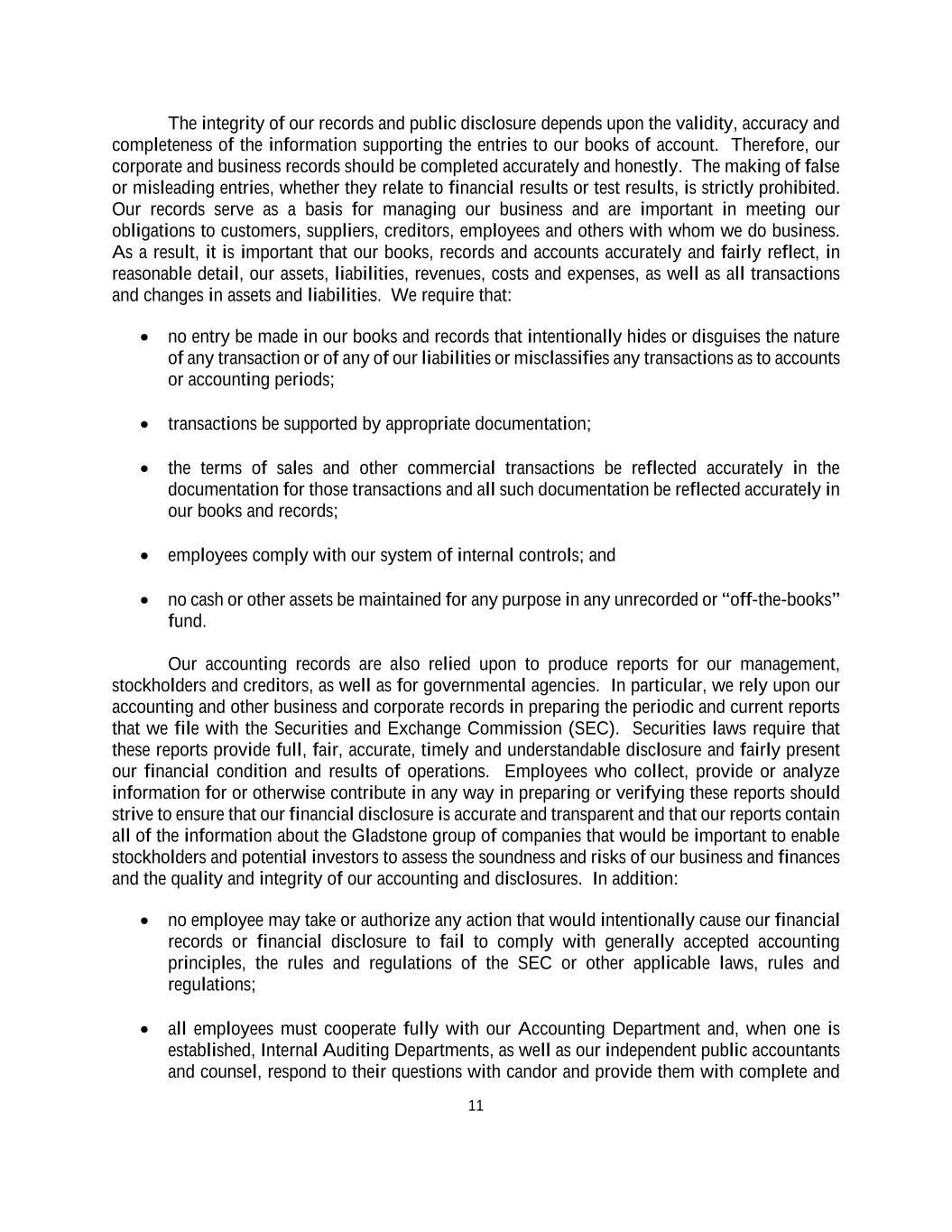 11 The integrity of our records and public disclosure depends upon the validity, accuracy and completeness of the information supporting the entries to our books of account. Therefore, our corporate and business records should be completed accurately and honestly. The making of false or misleading entries, whether they relate to financial results or test results, is strictly prohibited. Our records serve as a basis for managing our business and are important in meeting our obligations to customers, suppliers, creditors, employees and others with whom we do business. As a result, it is important that our books, records and accounts accurately and fairly reflect, in reasonable detail, our assets, liabilities, revenues, costs and expenses, as well as all transactions and changes in assets and liabilities. We require that: • no entry be made in our books and records that intentionally hides or disguises the nature of any transaction or of any of our liabilities or misclassifies any transactions as to accounts or accounting periods; • transactions be supported by appropriate documentation; • the terms of sales and other commercial transactions be reflected accurately in the documentation for those transactions and all such documentation be reflected accurately in our books and records; • employees comply with our system of internal controls; and • no cash or other assets be maintained for any purpose in any unrecorded or “off-the-books” fund. Our accounting records are also relied upon to produce reports for our management, stockholders and creditors, as well as for governmental agencies. In particular, we rely upon our accounting and other business and corporate records in preparing the periodic and current reports that we file with the Securities and Exchange Commission (SEC). Securities laws require that these reports provide full, fair, accurate, timely and understandable disclosure and fairly present our financial condition and results of operations. Employees who collect, provide or analyze information for or otherwise contribute in any way in preparing or verifying these reports should strive to ensure that our financial disclosure is accurate and transparent and that our reports contain all of the information about the Gladstone group of companies that would be important to enable stockholders and potential investors to assess the soundness and risks of our business and finances and the quality and integrity of our accounting and disclosures. In addition: • no employee may take or authorize any action that would intentionally cause our financial records or financial disclosure to fail to comply with generally accepted accounting principles, the rules and regulations of the SEC or other applicable laws, rules and regulations; • all employees must cooperate fully with our Accounting Department and, when one is established, Internal Auditing Departments, as well as our independent public accountants and counsel, respond to their questions with candor and provide them with complete and