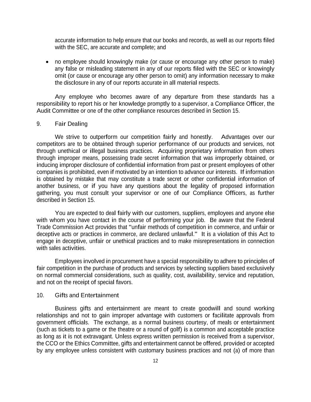 12 accurate information to help ensure that our books and records, as well as our reports filed with the SEC, are accurate and complete; and • no employee should knowingly make (or cause or encourage any other person to make) any false or misleading statement in any of our reports filed with the SEC or knowingly omit (or cause or encourage any other person to omit) any information necessary to make the disclosure in any of our reports accurate in all material respects. Any employee who becomes aware of any departure from these standards has a responsibility to report his or her knowledge promptly to a supervisor, a Compliance Officer, the Audit Committee or one of the other compliance resources described in Section 15. 9. Fair Dealing We strive to outperform our competition fairly and honestly. Advantages over our competitors are to be obtained through superior performance of our products and services, not through unethical or illegal business practices. Acquiring proprietary information from others through improper means, possessing trade secret information that was improperly obtained, or inducing improper disclosure of confidential information from past or present employees of other companies is prohibited, even if motivated by an intention to advance our interests. If information is obtained by mistake that may constitute a trade secret or other confidential information of another business, or if you have any questions about the legality of proposed information gathering, you must consult your supervisor or one of our Compliance Officers, as further described in Section 15. You are expected to deal fairly with our customers, suppliers, employees and anyone else with whom you have contact in the course of performing your job. Be aware that the Federal Trade Commission Act provides that “unfair methods of competition in commerce, and unfair or deceptive acts or practices in commerce, are declared unlawful.” It is a violation of this Act to engage in deceptive, unfair or unethical practices and to make misrepresentations in connection with sales activities. Employees involved in procurement have a special responsibility to adhere to principles of fair competition in the purchase of products and services by selecting suppliers based exclusively on normal commercial considerations, such as quality, cost, availability, service and reputation, and not on the receipt of special favors. 10. Gifts and Entertainment Business gifts and entertainment are meant to create goodwill and sound working relationships and not to gain improper advantage with customers or facilitate approvals from government officials. The exchange, as a normal business courtesy, of meals or entertainment (such as tickets to a game or the theatre or a round of golf) is a common and acceptable practice as long as it is not extravagant. Unless express written permission is received from a supervisor, the CCO or the Ethics Committee, gifts and entertainment cannot be offered, provided or accepted by any employee unless consistent with customary business practices and not (a) of more than