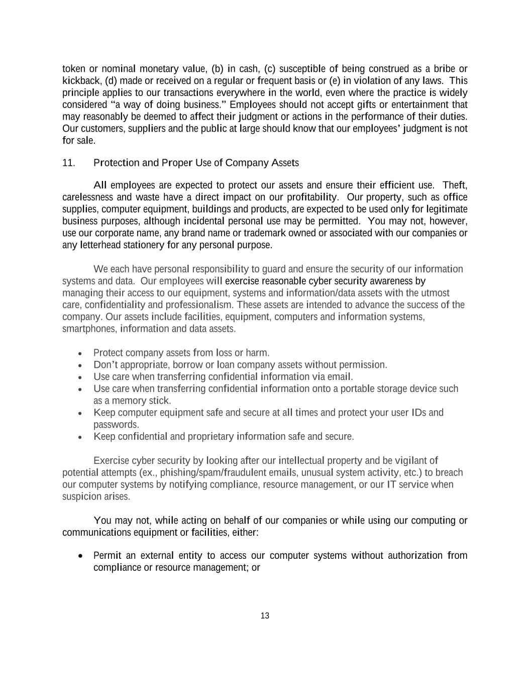 13 token or nominal monetary value, (b) in cash, (c) susceptible of being construed as a bribe or kickback, (d) made or received on a regular or frequent basis or (e) in violation of any laws. This principle applies to our transactions everywhere in the world, even where the practice is widely considered “a way of doing business.” Employees should not accept gifts or entertainment that may reasonably be deemed to affect their judgment or actions in the performance of their duties. Our customers, suppliers and the public at large should know that our employees’ judgment is not for sale. 11. Protection and Proper Use of Company Assets All employees are expected to protect our assets and ensure their efficient use. Theft, carelessness and waste have a direct impact on our profitability. Our property, such as office supplies, computer equipment, buildings and products, are expected to be used only for legitimate business purposes, although incidental personal use may be permitted. You may not, however, use our corporate name, any brand name or trademark owned or associated with our companies or any letterhead stationery for any personal purpose. We each have personal responsibility to guard and ensure the security of our information systems and data. Our employees will exercise reasonable cyber security awareness by managing their access to our equipment, systems and information/data assets with the utmost care, confidentiality and professionalism. These assets are intended to advance the success of the company. Our assets include facilities, equipment, computers and information systems, smartphones, information and data assets. • Protect company assets from loss or harm. • Don’t appropriate, borrow or loan company assets without permission. • Use care when transferring confidential information via email. • Use care when transferring confidential information onto a portable storage device such as a memory stick. • Keep computer equipment safe and secure at all times and protect your user IDs and passwords. • Keep confidential and proprietary information safe and secure. Exercise cyber security by looking after our intellectual property and be vigilant of potential attempts (ex., phishing/spam/fraudulent emails, unusual system activity, etc.) to breach our computer systems by notifying compliance, resource management, or our IT service when suspicion arises. You may not, while acting on behalf of our companies or while using our computing or communications equipment or facilities, either: • Permit an external entity to access our computer systems without authorization from compliance or resource management; or