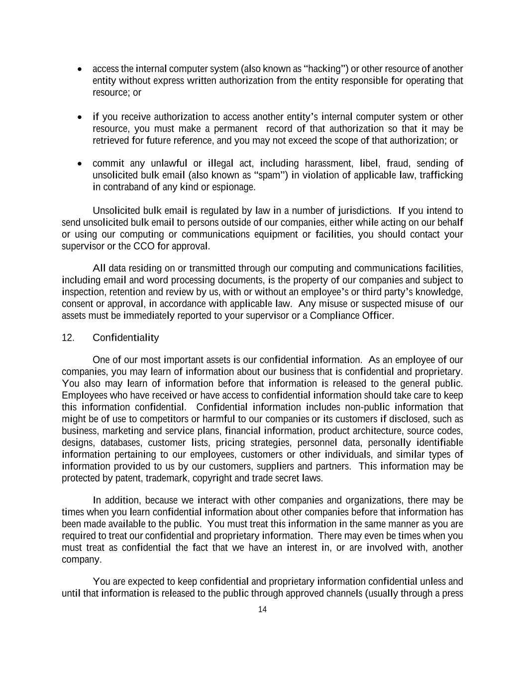 14 • access the internal computer system (also known as “hacking”) or other resource of another entity without express written authorization from the entity responsible for operating that resource; or • if you receive authorization to access another entity’s internal computer system or other resource, you must make a permanent record of that authorization so that it may be retrieved for future reference, and you may not exceed the scope of that authorization; or • commit any unlawful or illegal act, including harassment, libel, fraud, sending of unsolicited bulk email (also known as “spam”) in violation of applicable law, trafficking in contraband of any kind or espionage. Unsolicited bulk email is regulated by law in a number of jurisdictions. If you intend to send unsolicited bulk email to persons outside of our companies, either while acting on our behalf or using our computing or communications equipment or facilities, you should contact your supervisor or the CCO for approval. All data residing on or transmitted through our computing and communications facilities, including email and word processing documents, is the property of our companies and subject to inspection, retention and review by us, with or without an employee’s or third party’s knowledge, consent or approval, in accordance with applicable law. Any misuse or suspected misuse of our assets must be immediately reported to your supervisor or a Compliance Officer. 12. Confidentiality One of our most important assets is our confidential information. As an employee of our companies, you may learn of information about our business that is confidential and proprietary. You also may learn of information before that information is released to the general public. Employees who have received or have access to confidential information should take care to keep this information confidential. Confidential information includes non-public information that might be of use to competitors or harmful to our companies or its customers if disclosed, such as business, marketing and service plans, financial information, product architecture, source codes, designs, databases, customer lists, pricing strategies, personnel data, personally identifiable information pertaining to our employees, customers or other individuals, and similar types of information provided to us by our customers, suppliers and partners. This information may be protected by patent, trademark, copyright and trade secret laws. In addition, because we interact with other companies and organizations, there may be times when you learn confidential information about other companies before that information has been made available to the public. You must treat this information in the same manner as you are required to treat our confidential and proprietary information. There may even be times when you must treat as confidential the fact that we have an interest in, or are involved with, another company. You are expected to keep confidential and proprietary information confidential unless and until that information is released to the public through approved channels (usually through a press