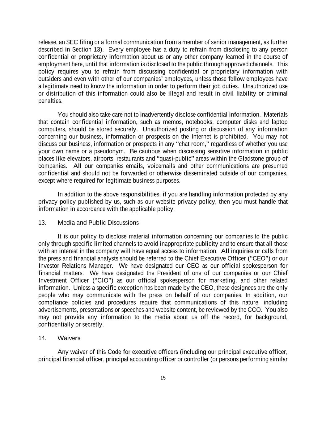 15 release, an SEC filing or a formal communication from a member of senior management, as further described in Section 13). Every employee has a duty to refrain from disclosing to any person confidential or proprietary information about us or any other company learned in the course of employment here, until that information is disclosed to the public through approved channels. This policy requires you to refrain from discussing confidential or proprietary information with outsiders and even with other of our companies’ employees, unless those fellow employees have a legitimate need to know the information in order to perform their job duties. Unauthorized use or distribution of this information could also be illegal and result in civil liability or criminal penalties. You should also take care not to inadvertently disclose confidential information. Materials that contain confidential information, such as memos, notebooks, computer disks and laptop computers, should be stored securely. Unauthorized posting or discussion of any information concerning our business, information or prospects on the Internet is prohibited. You may not discuss our business, information or prospects in any “chat room,” regardless of whether you use your own name or a pseudonym. Be cautious when discussing sensitive information in public places like elevators, airports, restaurants and “quasi-public” areas within the Gladstone group of companies. All our companies emails, voicemails and other communications are presumed confidential and should not be forwarded or otherwise disseminated outside of our companies, except where required for legitimate business purposes. In addition to the above responsibilities, if you are handling information protected by any privacy policy published by us, such as our website privacy policy, then you must handle that information in accordance with the applicable policy. 13. Media and Public Discussions It is our policy to disclose material information concerning our companies to the public only through specific limited channels to avoid inappropriate publicity and to ensure that all those with an interest in the company will have equal access to information. All inquiries or calls from the press and financial analysts should be referred to the Chief Executive Officer (“CEO”) or our Investor Relations Manager. We have designated our CEO as our official spokesperson for financial matters. We have designated the President of one of our companies or our Chief Investment Officer (“CIO”) as our official spokesperson for marketing, and other related information. Unless a specific exception has been made by the CEO, these designees are the only people who may communicate with the press on behalf of our companies. In addition, our compliance policies and procedures require that communications of this nature, including advertisements, presentations or speeches and website content, be reviewed by the CCO. You also may not provide any information to the media about us off the record, for background, confidentially or secretly. 14. Waivers Any waiver of this Code for executive officers (including our principal executive officer, principal financial officer, principal accounting officer or controller (or persons performing similar