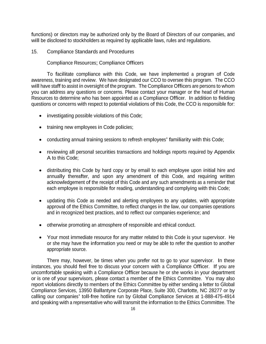 16 functions) or directors may be authorized only by the Board of Directors of our companies, and will be disclosed to stockholders as required by applicable laws, rules and regulations. 15. Compliance Standards and Procedures Compliance Resources; Compliance Officers To facilitate compliance with this Code, we have implemented a program of Code awareness, training and review. We have designated our CCO to oversee this program. The CCO will have staff to assist in oversight of the program. The Compliance Officers are persons to whom you can address any questions or concerns. Please contact your manager or the head of Human Resources to determine who has been appointed as a Compliance Officer. In addition to fielding questions or concerns with respect to potential violations of this Code, the CCO is responsible for: • investigating possible violations of this Code; • training new employees in Code policies; • conducting annual training sessions to refresh employees’ familiarity with this Code; • reviewing all personal securities transactions and holdings reports required by Appendix A to this Code; • distributing this Code by hard copy or by email to each employee upon initial hire and annually thereafter, and upon any amendment of this Code, and requiring written acknowledgement of the receipt of this Code and any such amendments as a reminder that each employee is responsible for reading, understanding and complying with this Code; • updating this Code as needed and alerting employees to any updates, with appropriate approval of the Ethics Committee, to reflect changes in the law, our companies operations and in recognized best practices, and to reflect our companies experience; and • otherwise promoting an atmosphere of responsible and ethical conduct. • Your most immediate resource for any matter related to this Code is your supervisor. He or she may have the information you need or may be able to refer the question to another appropriate source. There may, however, be times when you prefer not to go to your supervisor. In these instances, you should feel free to discuss your concern with a Compliance Officer. If you are uncomfortable speaking with a Compliance Officer because he or she works in your department or is one of your supervisors, please contact a member of the Ethics Committee. You may also report violations directly to members of the Ethics Committee by either sending a letter to Global Compliance Services, 13950 Ballantyne Corporate Place, Suite 300, Charlotte, NC 28277 or by calling our companies’ toll-free hotline run by Global Compliance Services at 1-888-475-4914 and speaking with a representative who will transmit the information to the Ethics Committee. The