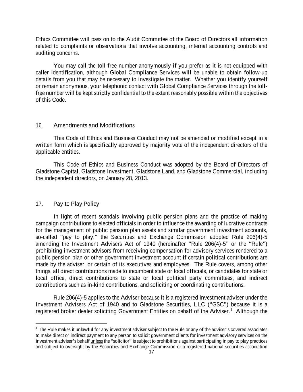 17 Ethics Committee will pass on to the Audit Committee of the Board of Directors all information related to complaints or observations that involve accounting, internal accounting controls and auditing concerns. You may call the toll-free number anonymously if you prefer as it is not equipped with caller identification, although Global Compliance Services will be unable to obtain follow-up details from you that may be necessary to investigate the matter. Whether you identify yourself or remain anonymous, your telephonic contact with Global Compliance Services through the toll- free number will be kept strictly confidential to the extent reasonably possible within the objectives of this Code. 16. Amendments and Modifications This Code of Ethics and Business Conduct may not be amended or modified except in a written form which is specifically approved by majority vote of the independent directors of the applicable entities. This Code of Ethics and Business Conduct was adopted by the Board of Directors of Gladstone Capital, Gladstone Investment, Gladstone Land, and Gladstone Commercial, including the independent directors, on January 28, 2013. 17. Pay to Play Policy In light of recent scandals involving public pension plans and the practice of making campaign contributions to elected officials in order to influence the awarding of lucrative contracts for the management of public pension plan assets and similar government investment accounts, so-called “pay to play,” the Securities and Exchange Commission adopted Rule 206(4)-5 amending the Investment Advisers Act of 1940 (hereinafter “Rule 206(4)-5” or the “Rule”) prohibiting investment advisors from receiving compensation for advisory services rendered to a public pension plan or other government investment account if certain political contributions are made by the adviser, or certain of its executives and employees. The Rule covers, among other things, all direct contributions made to incumbent state or local officials, or candidates for state or local office, direct contributions to state or local political party committees, and indirect contributions such as in-kind contributions, and soliciting or coordinating contributions. Rule 206(4)-5 applies to the Adviser because it is a registered investment adviser under the Investment Advisers Act of 1940 and to Gladstone Securities, LLC (“GSC”) because it is a registered broker dealer soliciting Government Entities on behalf of the Adviser.1 Although the 1 The Rule makes it unlawful for any investment adviser subject to the Rule or any of the adviser’s covered associates to make direct or indirect payment to any person to solicit government clients for investment advisory services on the investment adviser’s behalf unless the “solicitor” is subject to prohibitions against participating in pay to play practices and subject to oversight by the Securities and Exchange Commission or a registered national securities association