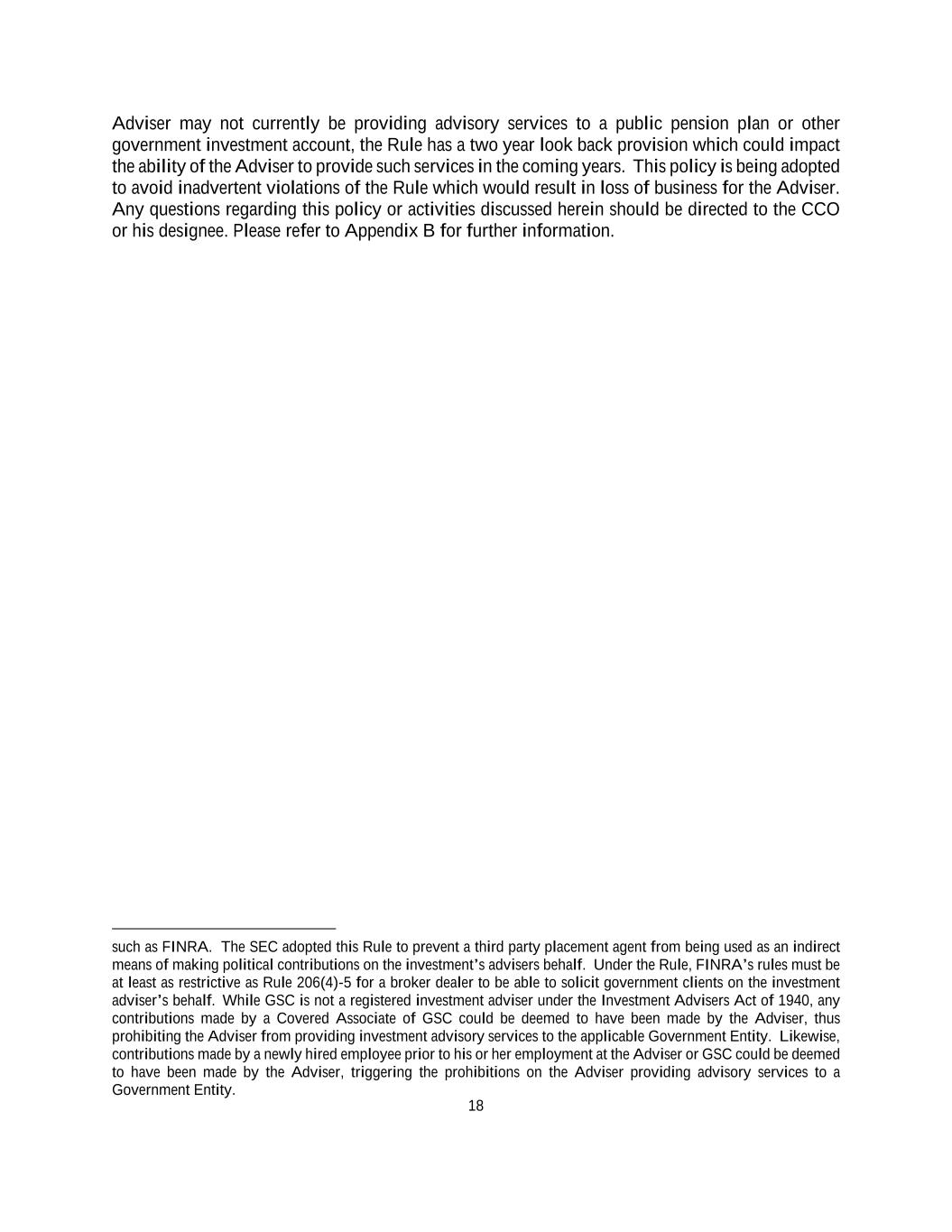 18 Adviser may not currently be providing advisory services to a public pension plan or other government investment account, the Rule has a two year look back provision which could impact the ability of the Adviser to provide such services in the coming years. This policy is being adopted to avoid inadvertent violations of the Rule which would result in loss of business for the Adviser. Any questions regarding this policy or activities discussed herein should be directed to the CCO or his designee. Please refer to Appendix B for further information. such as FINRA. The SEC adopted this Rule to prevent a third party placement agent from being used as an indirect means of making political contributions on the investment’s advisers behalf. Under the Rule, FINRA’s rules must be at least as restrictive as Rule 206(4)-5 for a broker dealer to be able to solicit government clients on the investment adviser’s behalf. While GSC is not a registered investment adviser under the Investment Advisers Act of 1940, any contributions made by a Covered Associate of GSC could be deemed to have been made by the Adviser, thus prohibiting the Adviser from providing investment advisory services to the applicable Government Entity. Likewise, contributions made by a newly hired employee prior to his or her employment at the Adviser or GSC could be deemed to have been made by the Adviser, triggering the prohibitions on the Adviser providing advisory services to a Government Entity.