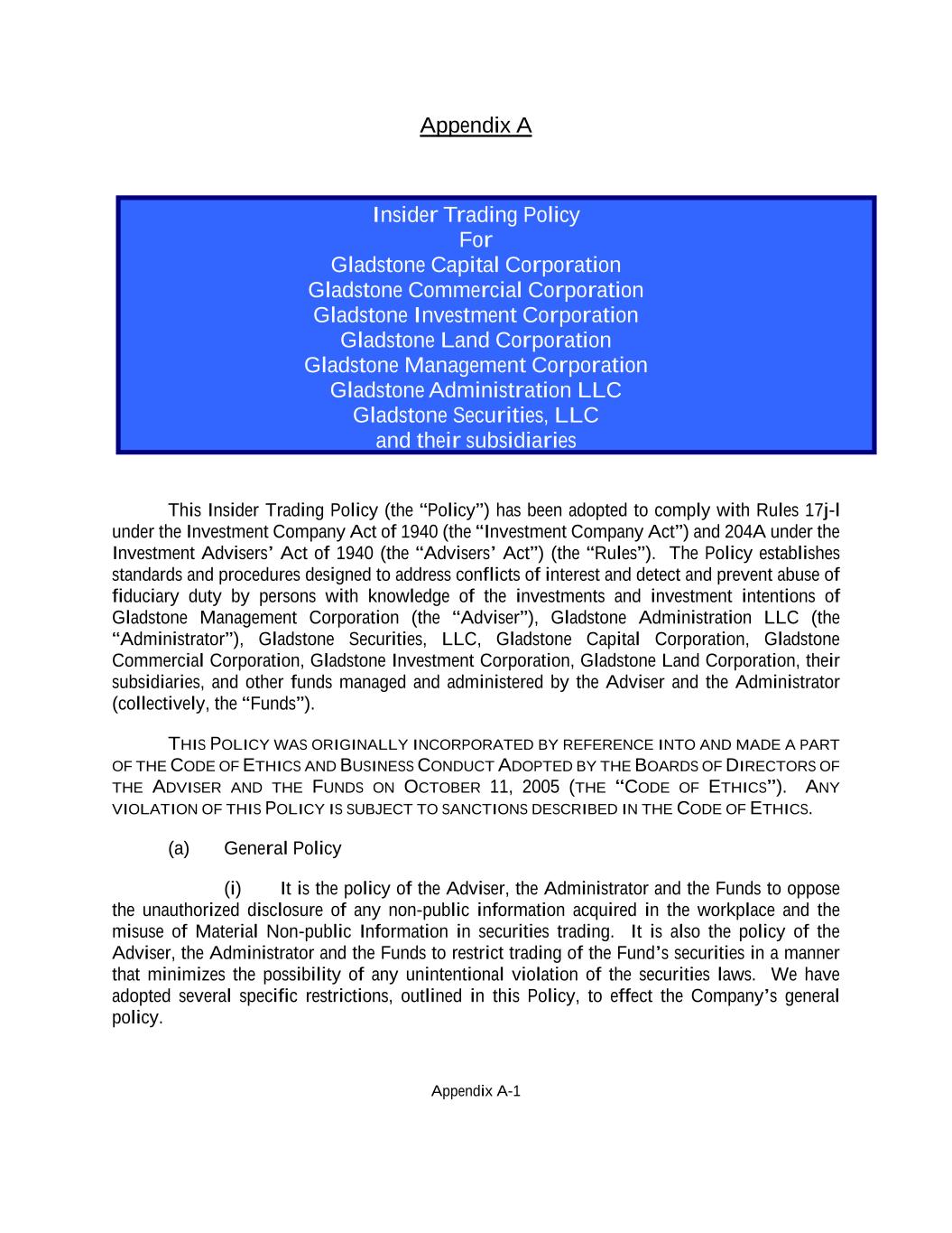 Appendix A-1 Appendix A Insider Trading Policy For Gladstone Capital Corporation Gladstone Commercial Corporation Gladstone Investment Corporation Gladstone Land Corporation Gladstone Management Corporation Gladstone Administration LLC Gladstone Securities, LLC and their subsidiaries This Insider Trading Policy (the “Policy”) has been adopted to comply with Rules 17j-l under the Investment Company Act of 1940 (the “Investment Company Act”) and 204A under the Investment Advisers’ Act of 1940 (the “Advisers’ Act”) (the “Rules”). The Policy establishes standards and procedures designed to address conflicts of interest and detect and prevent abuse of fiduciary duty by persons with knowledge of the investments and investment intentions of Gladstone Management Corporation (the “Adviser”), Gladstone Administration LLC (the “Administrator”), Gladstone Securities, LLC, Gladstone Capital Corporation, Gladstone Commercial Corporation, Gladstone Investment Corporation, Gladstone Land Corporation, their subsidiaries, and other funds managed and administered by the Adviser and the Administrator (collectively, the “Funds”). THIS POLICY WAS ORIGINALLY INCORPORATED BY REFERENCE INTO AND MADE A PART OF THE CODE OF ETHICS AND BUSINESS CONDUCT ADOPTED BY THE BOARDS OF DIRECTORS OF THE ADVISER AND THE FUNDS ON OCTOBER 11, 2005 (THE “CODE OF ETHICS”). ANY VIOLATION OF THIS POLICY IS SUBJECT TO SANCTIONS DESCRIBED IN THE CODE OF ETHICS. (a) General Policy (i) It is the policy of the Adviser, the Administrator and the Funds to oppose the unauthorized disclosure of any non-public information acquired in the workplace and the misuse of Material Non-public Information in securities trading. It is also the policy of the Adviser, the Administrator and the Funds to restrict trading of the Fund’s securities in a manner that minimizes the possibility of any unintentional violation of the securities laws. We have adopted several specific restrictions, outlined in this Policy, to effect the Company’s general policy.