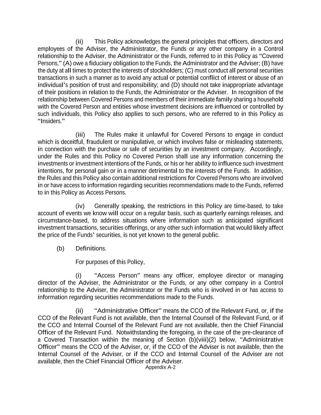 Appendix A-2 (ii) This Policy acknowledges the general principles that officers, directors and employees of the Adviser, the Administrator, the Funds or any other company in a Control relationship to the Adviser, the Administrator or the Funds, referred to in this Policy as “Covered Persons,” (A) owe a fiduciary obligation to the Funds, the Administrator and the Adviser; (B) have the duty at all times to protect the interests of stockholders; (C) must conduct all personal securities transactions in such a manner as to avoid any actual or potential conflict of interest or abuse of an individual’s position of trust and responsibility; and (D) should not take inappropriate advantage of their positions in relation to the Funds, the Administrator or the Adviser. In recognition of the relationship between Covered Persons and members of their immediate family sharing a household with the Covered Person and entities whose investment decisions are influenced or controlled by such individuals, this Policy also applies to such persons, who are referred to in this Policy as “Insiders.” (iii) The Rules make it unlawful for Covered Persons to engage in conduct which is deceitful, fraudulent or manipulative, or which involves false or misleading statements, in connection with the purchase or sale of securities by an investment company. Accordingly, under the Rules and this Policy no Covered Person shall use any information concerning the investments or investment intentions of the Funds, or his or her ability to influence such investment intentions, for personal gain or in a manner detrimental to the interests of the Funds. In addition, the Rules and this Policy also contain additional restrictions for Covered Persons who are involved in or have access to information regarding securities recommendations made to the Funds, referred to in this Policy as Access Persons. (iv) Generally speaking, the restrictions in this Policy are time-based, to take account of events we know will occur on a regular basis, such as quarterly earnings releases, and circumstance-based, to address situations where information such as anticipated significant investment transactions, securities offerings, or any other such information that would likely affect the price of the Funds’ securities, is not yet known to the general public. (b) Definitions. For purposes of this Policy, (i) “Access Person” means any officer, employee director or managing director of the Adviser, the Administrator or the Funds, or any other company in a Control relationship to the Adviser, the Administrator or the Funds who is involved in or has access to information regarding securities recommendations made to the Funds. (ii) “Administrative Officer” means the CCO of the Relevant Fund, or, if the CCO of the Relevant Fund is not available, then the Internal Counsel of the Relevant Fund, or if the CCO and Internal Counsel of the Relevant Fund are not available, then the Chief Financial Officer of the Relevant Fund. Notwithstanding the foregoing, in the case of the pre-clearance of a Covered Transaction within the meaning of Section (b)(viii)(2) below, “Administrative Officer” means the CCO of the Adviser, or, if the CCO of the Adviser is not available, then the Internal Counsel of the Adviser, or if the CCO and Internal Counsel of the Adviser are not available, then the Chief Financial Officer of the Adviser.