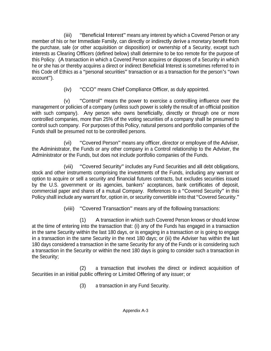Appendix A-3 (iii) “Beneficial Interest” means any interest by which a Covered Person or any member of his or her Immediate Family, can directly or indirectly derive a monetary benefit from the purchase, sale (or other acquisition or disposition) or ownership of a Security, except such interests as Clearing Officers (defined below) shall determine to be too remote for the purpose of this Policy. (A transaction in which a Covered Person acquires or disposes of a Security in which he or she has or thereby acquires a direct or indirect Beneficial Interest is sometimes referred to in this Code of Ethics as a “personal securities” transaction or as a transaction for the person’s “own account”). (iv) “CCO” means Chief Compliance Officer, as duly appointed. (v) “Control” means the power to exercise a controlling influence over the management or policies of a company (unless such power is solely the result of an official position with such company). Any person who owns beneficially, directly or through one or more controlled companies, more than 25% of the voting securities of a company shall be presumed to control such company. For purposes of this Policy, natural persons and portfolio companies of the Funds shall be presumed not to be controlled persons. (vi) “Covered Person” means any officer, director or employee of the Adviser, the Administrator, the Funds or any other company in a Control relationship to the Adviser, the Administrator or the Funds, but does not include portfolio companies of the Funds. (vii) “Covered Security” includes any Fund Securities and all debt obligations, stock and other instruments comprising the investments of the Funds, including any warrant or option to acquire or sell a security and financial futures contracts, but excludes securities issued by the U.S. government or its agencies, bankers’ acceptances, bank certificates of deposit, commercial paper and shares of a mutual Company. References to a “Covered Security” in this Policy shall include any warrant for, option in, or security convertible into that “Covered Security.” (viii) “Covered Transaction” means any of the following transactions: (1) A transaction in which such Covered Person knows or should know at the time of entering into the transaction that: (i) any of the Funds has engaged in a transaction in the same Security within the last 180 days, or is engaging in a transaction or is going to engage in a transaction in the same Security in the next 180 days; or (ii) the Adviser has within the last 180 days considered a transaction in the same Security for any of the Funds or is considering such a transaction in the Security or within the next 180 days is going to consider such a transaction in the Security; (2) a transaction that involves the direct or indirect acquisition of Securities in an initial public offering or Limited Offering of any issuer; or (3) a transaction in any Fund Security.