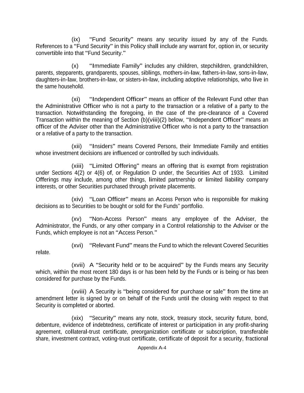 Appendix A-4 (ix) “Fund Security” means any security issued by any of the Funds. References to a “Fund Security” in this Policy shall include any warrant for, option in, or security convertible into that “Fund Security.” (x) “Immediate Family” includes any children, stepchildren, grandchildren, parents, stepparents, grandparents, spouses, siblings, mothers-in-law, fathers-in-law, sons-in-law, daughters-in-law, brothers-in-law, or sisters-in-law, including adoptive relationships, who live in the same household. (xi) “Independent Officer” means an officer of the Relevant Fund other than the Administrative Officer who is not a party to the transaction or a relative of a party to the transaction. Notwithstanding the foregoing, in the case of the pre-clearance of a Covered Transaction within the meaning of Section (b)(viii)(2) below, “Independent Officer” means an officer of the Adviser other than the Administrative Officer who is not a party to the transaction or a relative of a party to the transaction. (xii) “Insiders” means Covered Persons, their Immediate Family and entities whose investment decisions are influenced or controlled by such individuals. (xiii) “Limited Offering” means an offering that is exempt from registration under Sections 4(2) or 4(6) of, or Regulation D under, the Securities Act of 1933. Limited Offerings may include, among other things, limited partnership or limited liability company interests, or other Securities purchased through private placements. (xiv) “Loan Officer” means an Access Person who is responsible for making decisions as to Securities to be bought or sold for the Funds’ portfolio. (xv) “Non-Access Person” means any employee of the Adviser, the Administrator, the Funds, or any other company in a Control relationship to the Adviser or the Funds, which employee is not an “Access Person.” (xvi) “Relevant Fund” means the Fund to which the relevant Covered Securities relate. (xvii) A “Security held or to be acquired” by the Funds means any Security which, within the most recent 180 days is or has been held by the Funds or is being or has been considered for purchase by the Funds. (xviii) A Security is “being considered for purchase or sale” from the time an amendment letter is signed by or on behalf of the Funds until the closing with respect to that Security is completed or aborted. (xix) “Security” means any note, stock, treasury stock, security future, bond, debenture, evidence of indebtedness, certificate of interest or participation in any profit-sharing agreement, collateral-trust certificate, preorganization certificate or subscription, transferable share, investment contract, voting-trust certificate, certificate of deposit for a security, fractional