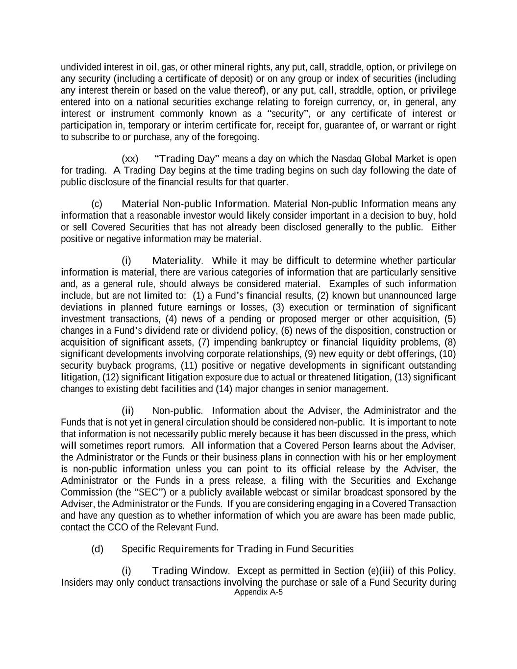 Appendix A-5 undivided interest in oil, gas, or other mineral rights, any put, call, straddle, option, or privilege on any security (including a certificate of deposit) or on any group or index of securities (including any interest therein or based on the value thereof), or any put, call, straddle, option, or privilege entered into on a national securities exchange relating to foreign currency, or, in general, any interest or instrument commonly known as a “security”, or any certificate of interest or participation in, temporary or interim certificate for, receipt for, guarantee of, or warrant or right to subscribe to or purchase, any of the foregoing. (xx) “Trading Day” means a day on which the Nasdaq Global Market is open for trading. A Trading Day begins at the time trading begins on such day following the date of public disclosure of the financial results for that quarter. (c) Material Non-public Information. Material Non-public Information means any information that a reasonable investor would likely consider important in a decision to buy, hold or sell Covered Securities that has not already been disclosed generally to the public. Either positive or negative information may be material. (i) Materiality. While it may be difficult to determine whether particular information is material, there are various categories of information that are particularly sensitive and, as a general rule, should always be considered material. Examples of such information include, but are not limited to: (1) a Fund’s financial results, (2) known but unannounced large deviations in planned future earnings or losses, (3) execution or termination of significant investment transactions, (4) news of a pending or proposed merger or other acquisition, (5) changes in a Fund’s dividend rate or dividend policy, (6) news of the disposition, construction or acquisition of significant assets, (7) impending bankruptcy or financial liquidity problems, (8) significant developments involving corporate relationships, (9) new equity or debt offerings, (10) security buyback programs, (11) positive or negative developments in significant outstanding litigation, (12) significant litigation exposure due to actual or threatened litigation, (13) significant changes to existing debt facilities and (14) major changes in senior management. (ii) Non-public. Information about the Adviser, the Administrator and the Funds that is not yet in general circulation should be considered non-public. It is important to note that information is not necessarily public merely because it has been discussed in the press, which will sometimes report rumors. All information that a Covered Person learns about the Adviser, the Administrator or the Funds or their business plans in connection with his or her employment is non-public information unless you can point to its official release by the Adviser, the Administrator or the Funds in a press release, a filing with the Securities and Exchange Commission (the “SEC”) or a publicly available webcast or similar broadcast sponsored by the Adviser, the Administrator or the Funds. If you are considering engaging in a Covered Transaction and have any question as to whether information of which you are aware has been made public, contact the CCO of the Relevant Fund. (d) Specific Requirements for Trading in Fund Securities (i) Trading Window. Except as permitted in Section (e)(iii) of this Policy, Insiders may only conduct transactions involving the purchase or sale of a Fund Security during