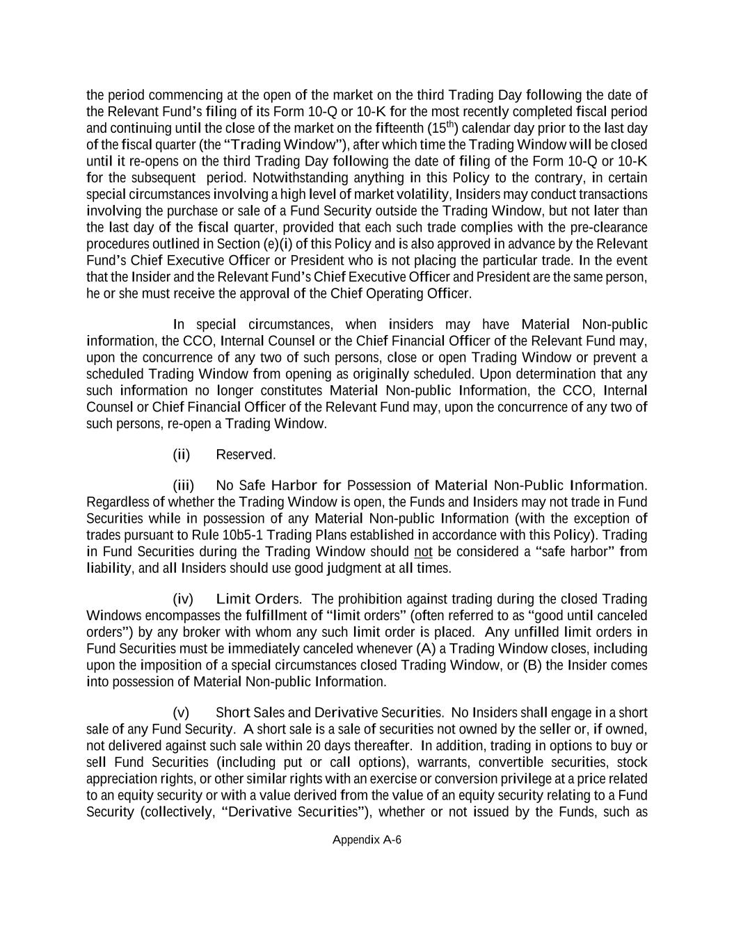 Appendix A-6 the period commencing at the open of the market on the third Trading Day following the date of the Relevant Fund’s filing of its Form 10-Q or 10-K for the most recently completed fiscal period and continuing until the close of the market on the fifteenth (15th) calendar day prior to the last day of the fiscal quarter (the “Trading Window”), after which time the Trading Window will be closed until it re-opens on the third Trading Day following the date of filing of the Form 10-Q or 10-K for the subsequent period. Notwithstanding anything in this Policy to the contrary, in certain special circumstances involving a high level of market volatility, Insiders may conduct transactions involving the purchase or sale of a Fund Security outside the Trading Window, but not later than the last day of the fiscal quarter, provided that each such trade complies with the pre-clearance procedures outlined in Section (e)(i) of this Policy and is also approved in advance by the Relevant Fund’s Chief Executive Officer or President who is not placing the particular trade. In the event that the Insider and the Relevant Fund’s Chief Executive Officer and President are the same person, he or she must receive the approval of the Chief Operating Officer. In special circumstances, when insiders may have Material Non-public information, the CCO, Internal Counsel or the Chief Financial Officer of the Relevant Fund may, upon the concurrence of any two of such persons, close or open Trading Window or prevent a scheduled Trading Window from opening as originally scheduled. Upon determination that any such information no longer constitutes Material Non-public Information, the CCO, Internal Counsel or Chief Financial Officer of the Relevant Fund may, upon the concurrence of any two of such persons, re-open a Trading Window. (ii) Reserved. (iii) No Safe Harbor for Possession of Material Non-Public Information. Regardless of whether the Trading Window is open, the Funds and Insiders may not trade in Fund Securities while in possession of any Material Non-public Information (with the exception of trades pursuant to Rule 10b5-1 Trading Plans established in accordance with this Policy). Trading in Fund Securities during the Trading Window should not be considered a “safe harbor” from liability, and all Insiders should use good judgment at all times. (iv) Limit Orders. The prohibition against trading during the closed Trading Windows encompasses the fulfillment of “limit orders” (often referred to as “good until canceled orders”) by any broker with whom any such limit order is placed. Any unfilled limit orders in Fund Securities must be immediately canceled whenever (A) a Trading Window closes, including upon the imposition of a special circumstances closed Trading Window, or (B) the Insider comes into possession of Material Non-public Information. (v) Short Sales and Derivative Securities. No Insiders shall engage in a short sale of any Fund Security. A short sale is a sale of securities not owned by the seller or, if owned, not delivered against such sale within 20 days thereafter. In addition, trading in options to buy or sell Fund Securities (including put or call options), warrants, convertible securities, stock appreciation rights, or other similar rights with an exercise or conversion privilege at a price related to an equity security or with a value derived from the value of an equity security relating to a Fund Security (collectively, “Derivative Securities”), whether or not issued by the Funds, such as