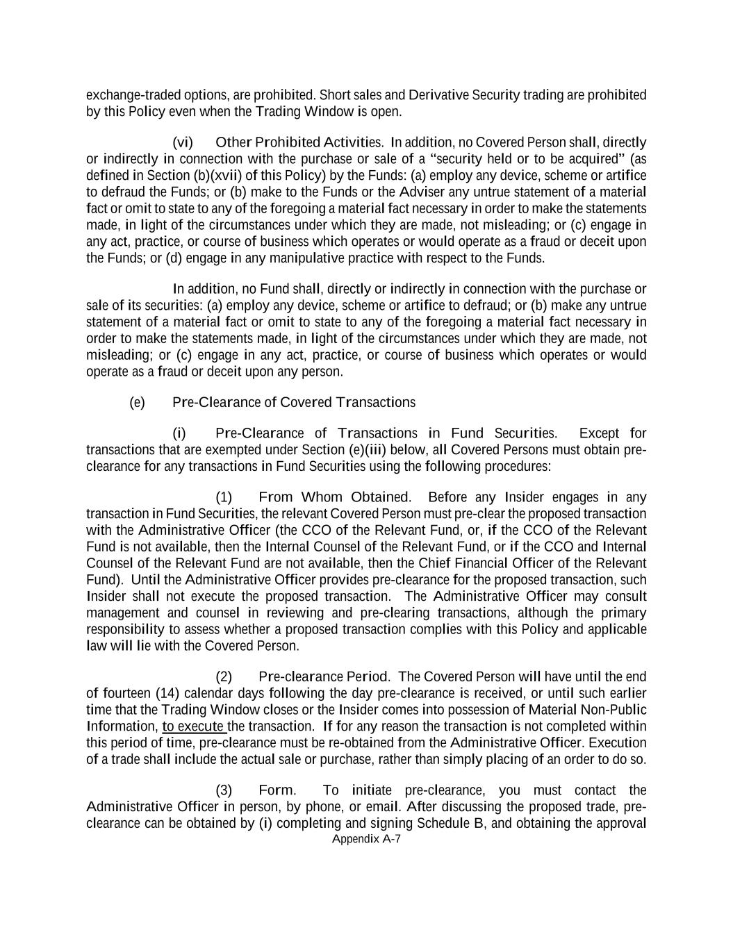 Appendix A-7 exchange-traded options, are prohibited. Short sales and Derivative Security trading are prohibited by this Policy even when the Trading Window is open. (vi) Other Prohibited Activities. In addition, no Covered Person shall, directly or indirectly in connection with the purchase or sale of a “security held or to be acquired” (as defined in Section (b)(xvii) of this Policy) by the Funds: (a) employ any device, scheme or artifice to defraud the Funds; or (b) make to the Funds or the Adviser any untrue statement of a material fact or omit to state to any of the foregoing a material fact necessary in order to make the statements made, in light of the circumstances under which they are made, not misleading; or (c) engage in any act, practice, or course of business which operates or would operate as a fraud or deceit upon the Funds; or (d) engage in any manipulative practice with respect to the Funds. In addition, no Fund shall, directly or indirectly in connection with the purchase or sale of its securities: (a) employ any device, scheme or artifice to defraud; or (b) make any untrue statement of a material fact or omit to state to any of the foregoing a material fact necessary in order to make the statements made, in light of the circumstances under which they are made, not misleading; or (c) engage in any act, practice, or course of business which operates or would operate as a fraud or deceit upon any person. (e) Pre-Clearance of Covered Transactions (i) Pre-Clearance of Transactions in Fund Securities. Except for transactions that are exempted under Section (e)(iii) below, all Covered Persons must obtain pre- clearance for any transactions in Fund Securities using the following procedures: (1) From Whom Obtained. Before any Insider engages in any transaction in Fund Securities, the relevant Covered Person must pre-clear the proposed transaction with the Administrative Officer (the CCO of the Relevant Fund, or, if the CCO of the Relevant Fund is not available, then the Internal Counsel of the Relevant Fund, or if the CCO and Internal Counsel of the Relevant Fund are not available, then the Chief Financial Officer of the Relevant Fund). Until the Administrative Officer provides pre-clearance for the proposed transaction, such Insider shall not execute the proposed transaction. The Administrative Officer may consult management and counsel in reviewing and pre-clearing transactions, although the primary responsibility to assess whether a proposed transaction complies with this Policy and applicable law will lie with the Covered Person. (2) Pre-clearance Period. The Covered Person will have until the end of fourteen (14) calendar days following the day pre-clearance is received, or until such earlier time that the Trading Window closes or the Insider comes into possession of Material Non-Public Information, to execute the transaction. If for any reason the transaction is not completed within this period of time, pre-clearance must be re-obtained from the Administrative Officer. Execution of a trade shall include the actual sale or purchase, rather than simply placing of an order to do so. (3) Form. To initiate pre-clearance, you must contact the Administrative Officer in person, by phone, or email. After discussing the proposed trade, pre- clearance can be obtained by (i) completing and signing Schedule B, and obtaining the approval