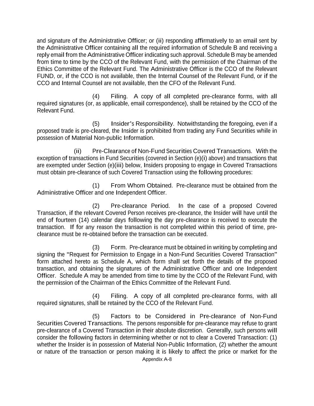 Appendix A-8 and signature of the Administrative Officer; or (ii) responding affirmatively to an email sent by the Administrative Officer containing all the required information of Schedule B and receiving a reply email from the Administrative Officer indicating such approval. Schedule B may be amended from time to time by the CCO of the Relevant Fund, with the permission of the Chairman of the Ethics Committee of the Relevant Fund. The Administrative Officer is the CCO of the Relevant FUND, or, if the CCO is not available, then the Internal Counsel of the Relevant Fund, or if the CCO and Internal Counsel are not available, then the CFO of the Relevant Fund. (4) Filing. A copy of all completed pre-clearance forms, with all required signatures (or, as applicable, email correspondence), shall be retained by the CCO of the Relevant Fund. (5) Insider’s Responsibility. Notwithstanding the foregoing, even if a proposed trade is pre-cleared, the Insider is prohibited from trading any Fund Securities while in possession of Material Non-public Information. (ii) Pre-Clearance of Non-Fund Securities Covered Transactions. With the exception of transactions in Fund Securities (covered in Section (e)(i) above) and transactions that are exempted under Section (e)(iii) below, Insiders proposing to engage in Covered Transactions must obtain pre-clearance of such Covered Transaction using the following procedures: (1) From Whom Obtained. Pre-clearance must be obtained from the Administrative Officer and one Independent Officer. (2) Pre-clearance Period. In the case of a proposed Covered Transaction, if the relevant Covered Person receives pre-clearance, the Insider will have until the end of fourteen (14) calendar days following the day pre-clearance is received to execute the transaction. If for any reason the transaction is not completed within this period of time, pre- clearance must be re-obtained before the transaction can be executed. (3) Form. Pre-clearance must be obtained in writing by completing and signing the “Request for Permission to Engage in a Non-Fund Securities Covered Transaction” form attached hereto as Schedule A, which form shall set forth the details of the proposed transaction, and obtaining the signatures of the Administrative Officer and one Independent Officer. Schedule A may be amended from time to time by the CCO of the Relevant Fund, with the permission of the Chairman of the Ethics Committee of the Relevant Fund. (4) Filing. A copy of all completed pre-clearance forms, with all required signatures, shall be retained by the CCO of the Relevant Fund. (5) Factors to be Considered in Pre-clearance of Non-Fund Securities Covered Transactions. The persons responsible for pre-clearance may refuse to grant pre-clearance of a Covered Transaction in their absolute discretion. Generally, such persons will consider the following factors in determining whether or not to clear a Covered Transaction: (1) whether the Insider is in possession of Material Non-Public Information, (2) whether the amount or nature of the transaction or person making it is likely to affect the price or market for the