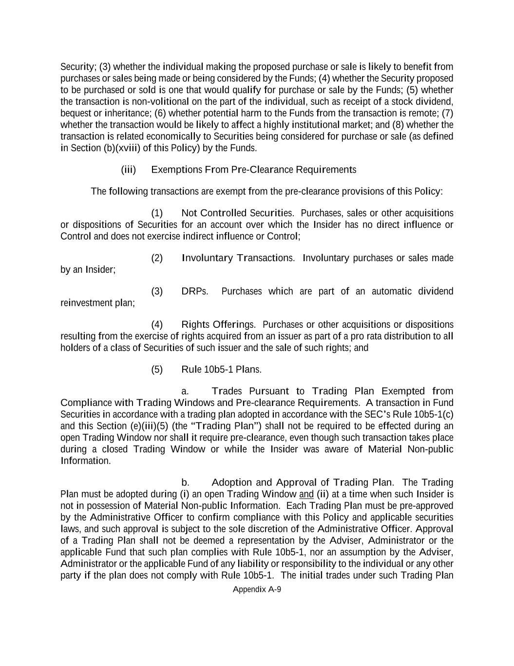 Appendix A-9 Security; (3) whether the individual making the proposed purchase or sale is likely to benefit from purchases or sales being made or being considered by the Funds; (4) whether the Security proposed to be purchased or sold is one that would qualify for purchase or sale by the Funds; (5) whether the transaction is non-volitional on the part of the individual, such as receipt of a stock dividend, bequest or inheritance; (6) whether potential harm to the Funds from the transaction is remote; (7) whether the transaction would be likely to affect a highly institutional market; and (8) whether the transaction is related economically to Securities being considered for purchase or sale (as defined in Section (b)(xviii) of this Policy) by the Funds. (iii) Exemptions From Pre-Clearance Requirements The following transactions are exempt from the pre-clearance provisions of this Policy: (1) Not Controlled Securities. Purchases, sales or other acquisitions or dispositions of Securities for an account over which the Insider has no direct influence or Control and does not exercise indirect influence or Control; (2) Involuntary Transactions. Involuntary purchases or sales made by an Insider; (3) DRPs. Purchases which are part of an automatic dividend reinvestment plan; (4) Rights Offerings. Purchases or other acquisitions or dispositions resulting from the exercise of rights acquired from an issuer as part of a pro rata distribution to all holders of a class of Securities of such issuer and the sale of such rights; and (5) Rule 10b5-1 Plans. a. Trades Pursuant to Trading Plan Exempted from Compliance with Trading Windows and Pre-clearance Requirements. A transaction in Fund Securities in accordance with a trading plan adopted in accordance with the SEC’s Rule 10b5-1(c) and this Section (e)(iii)(5) (the “Trading Plan”) shall not be required to be effected during an open Trading Window nor shall it require pre-clearance, even though such transaction takes place during a closed Trading Window or while the Insider was aware of Material Non-public Information. b. Adoption and Approval of Trading Plan. The Trading Plan must be adopted during (i) an open Trading Window and (ii) at a time when such Insider is not in possession of Material Non-public Information. Each Trading Plan must be pre-approved by the Administrative Officer to confirm compliance with this Policy and applicable securities laws, and such approval is subject to the sole discretion of the Administrative Officer. Approval of a Trading Plan shall not be deemed a representation by the Adviser, Administrator or the applicable Fund that such plan complies with Rule 10b5-1, nor an assumption by the Adviser, Administrator or the applicable Fund of any liability or responsibility to the individual or any other party if the plan does not comply with Rule 10b5-1. The initial trades under such Trading Plan