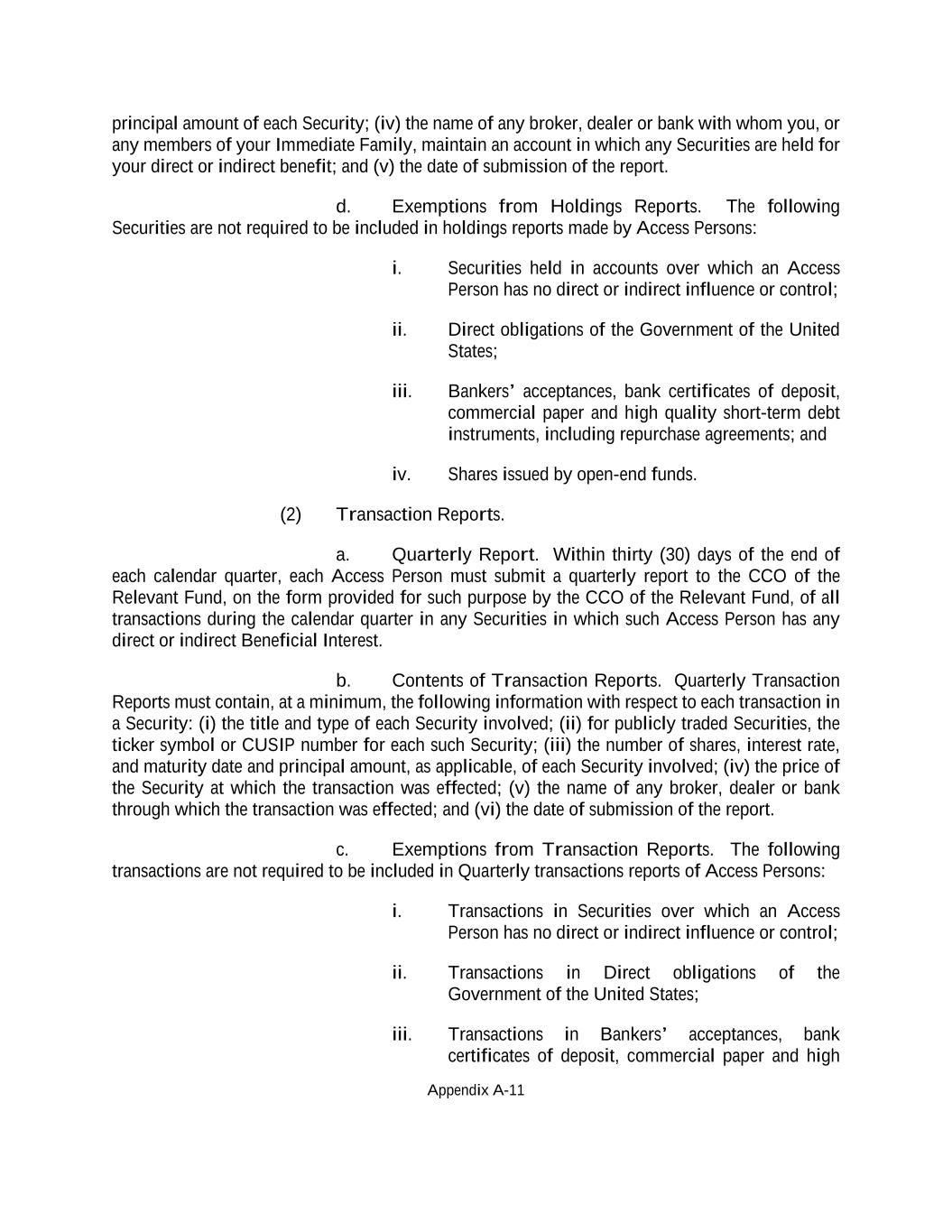 Appendix A-11 principal amount of each Security; (iv) the name of any broker, dealer or bank with whom you, or any members of your Immediate Family, maintain an account in which any Securities are held for your direct or indirect benefit; and (v) the date of submission of the report. d. Exemptions from Holdings Reports. The following Securities are not required to be included in holdings reports made by Access Persons: i. Securities held in accounts over which an Access Person has no direct or indirect influence or control; ii. Direct obligations of the Government of the United States; iii. Bankers’ acceptances, bank certificates of deposit, commercial paper and high quality short-term debt instruments, including repurchase agreements; and iv. Shares issued by open-end funds. (2) Transaction Reports. a. Quarterly Report. Within thirty (30) days of the end of each calendar quarter, each Access Person must submit a quarterly report to the CCO of the Relevant Fund, on the form provided for such purpose by the CCO of the Relevant Fund, of all transactions during the calendar quarter in any Securities in which such Access Person has any direct or indirect Beneficial Interest. b. Contents of Transaction Reports. Quarterly Transaction Reports must contain, at a minimum, the following information with respect to each transaction in a Security: (i) the title and type of each Security involved; (ii) for publicly traded Securities, the ticker symbol or CUSIP number for each such Security; (iii) the number of shares, interest rate, and maturity date and principal amount, as applicable, of each Security involved; (iv) the price of the Security at which the transaction was effected; (v) the name of any broker, dealer or bank through which the transaction was effected; and (vi) the date of submission of the report. c. Exemptions from Transaction Reports. The following transactions are not required to be included in Quarterly transactions reports of Access Persons: i. Transactions in Securities over which an Access Person has no direct or indirect influence or control; ii. Transactions in Direct obligations of the Government of the United States; iii. Transactions in Bankers’ acceptances, bank certificates of deposit, commercial paper and high