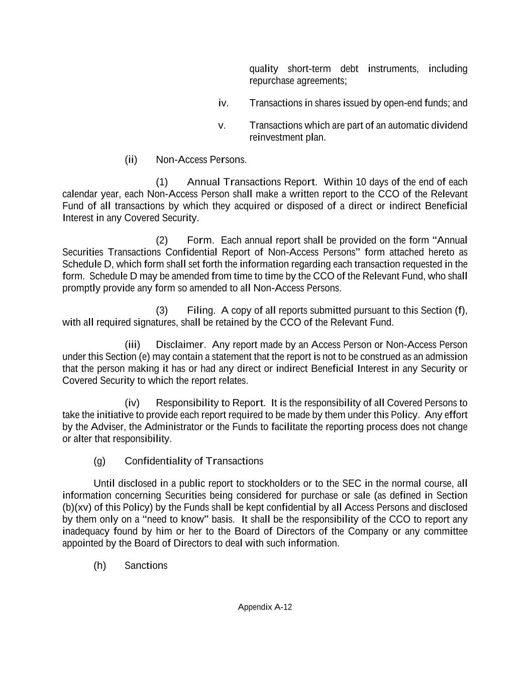 Appendix A-12 quality short-term debt instruments, including repurchase agreements; iv. Transactions in shares issued by open-end funds; and v. Transactions which are part of an automatic dividend reinvestment plan. (ii) Non-Access Persons. (1) Annual Transactions Report. Within 10 days of the end of each calendar year, each Non-Access Person shall make a written report to the CCO of the Relevant Fund of all transactions by which they acquired or disposed of a direct or indirect Beneficial Interest in any Covered Security. (2) Form. Each annual report shall be provided on the form “Annual Securities Transactions Confidential Report of Non-Access Persons” form attached hereto as Schedule D, which form shall set forth the information regarding each transaction requested in the form. Schedule D may be amended from time to time by the CCO of the Relevant Fund, who shall promptly provide any form so amended to all Non-Access Persons. (3) Filing. A copy of all reports submitted pursuant to this Section (f), with all required signatures, shall be retained by the CCO of the Relevant Fund. (iii) Disclaimer. Any report made by an Access Person or Non-Access Person under this Section (e) may contain a statement that the report is not to be construed as an admission that the person making it has or had any direct or indirect Beneficial Interest in any Security or Covered Security to which the report relates. (iv) Responsibility to Report. It is the responsibility of all Covered Persons to take the initiative to provide each report required to be made by them under this Policy. Any effort by the Adviser, the Administrator or the Funds to facilitate the reporting process does not change or alter that responsibility. (g) Confidentiality of Transactions Until disclosed in a public report to stockholders or to the SEC in the normal course, all information concerning Securities being considered for purchase or sale (as defined in Section (b)(xv) of this Policy) by the Funds shall be kept confidential by all Access Persons and disclosed by them only on a “need to know” basis. It shall be the responsibility of the CCO to report any inadequacy found by him or her to the Board of Directors of the Company or any committee appointed by the Board of Directors to deal with such information. (h) Sanctions