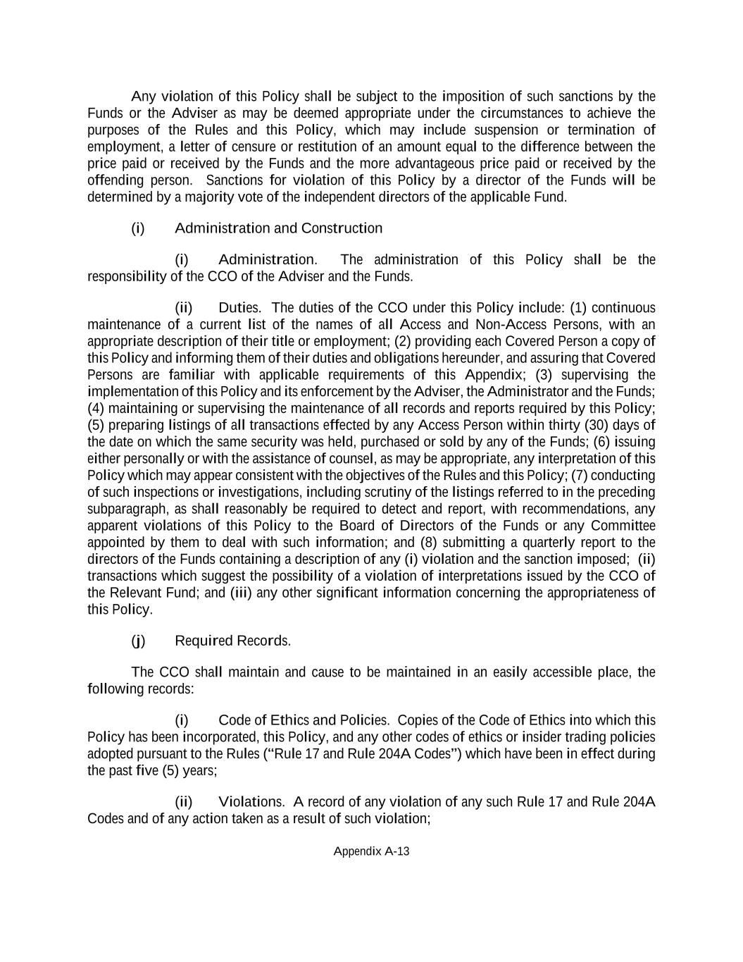 Appendix A-13 Any violation of this Policy shall be subject to the imposition of such sanctions by the Funds or the Adviser as may be deemed appropriate under the circumstances to achieve the purposes of the Rules and this Policy, which may include suspension or termination of employment, a letter of censure or restitution of an amount equal to the difference between the price paid or received by the Funds and the more advantageous price paid or received by the offending person. Sanctions for violation of this Policy by a director of the Funds will be determined by a majority vote of the independent directors of the applicable Fund. (i) Administration and Construction (i) Administration. The administration of this Policy shall be the responsibility of the CCO of the Adviser and the Funds. (ii) Duties. The duties of the CCO under this Policy include: (1) continuous maintenance of a current list of the names of all Access and Non-Access Persons, with an appropriate description of their title or employment; (2) providing each Covered Person a copy of this Policy and informing them of their duties and obligations hereunder, and assuring that Covered Persons are familiar with applicable requirements of this Appendix; (3) supervising the implementation of this Policy and its enforcement by the Adviser, the Administrator and the Funds; (4) maintaining or supervising the maintenance of all records and reports required by this Policy; (5) preparing listings of all transactions effected by any Access Person within thirty (30) days of the date on which the same security was held, purchased or sold by any of the Funds; (6) issuing either personally or with the assistance of counsel, as may be appropriate, any interpretation of this Policy which may appear consistent with the objectives of the Rules and this Policy; (7) conducting of such inspections or investigations, including scrutiny of the listings referred to in the preceding subparagraph, as shall reasonably be required to detect and report, with recommendations, any apparent violations of this Policy to the Board of Directors of the Funds or any Committee appointed by them to deal with such information; and (8) submitting a quarterly report to the directors of the Funds containing a description of any (i) violation and the sanction imposed; (ii) transactions which suggest the possibility of a violation of interpretations issued by the CCO of the Relevant Fund; and (iii) any other significant information concerning the appropriateness of this Policy. (j) Required Records. The CCO shall maintain and cause to be maintained in an easily accessible place, the following records: (i) Code of Ethics and Policies. Copies of the Code of Ethics into which this Policy has been incorporated, this Policy, and any other codes of ethics or insider trading policies adopted pursuant to the Rules (“Rule 17 and Rule 204A Codes”) which have been in effect during the past five (5) years; (ii) Violations. A record of any violation of any such Rule 17 and Rule 204A Codes and of any action taken as a result of such violation;