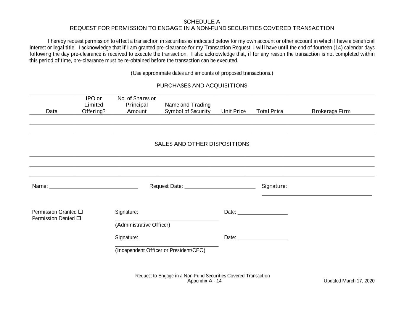 Request to Engage in a Non-Fund Securities Covered Transaction Appendix A - 14 Updated March 17, 2020 SCHEDULE A REQUEST FOR PERMISSION TO ENGAGE IN A NON-FUND SECURITIES COVERED TRANSACTION I hereby request permission to effect a transaction in securities as indicated below for my own account or other account in which I have a beneficial interest or legal title. I acknowledge that if I am granted pre-clearance for my Transaction Request, I will have until the end of fourteen (14) calendar days following the day pre-clearance is received to execute the transaction. I also acknowledge that, if for any reason the transaction is not completed within this period of time, pre-clearance must be re-obtained before the transaction can be executed. (Use approximate dates and amounts of proposed transactions.) PURCHASES AND ACQUISITIONS Date IPO or Limited Offering? No. of Shares or Principal Amount Name and Trading Symbol of Security Unit Price Total Price Brokerage Firm SALES AND OTHER DISPOSITIONS Name: Request Date: Signature: Permission Granted Permission Denied Signature: (Administrative Officer) Date: Signature: Date: (Independent Officer or President/CEO)