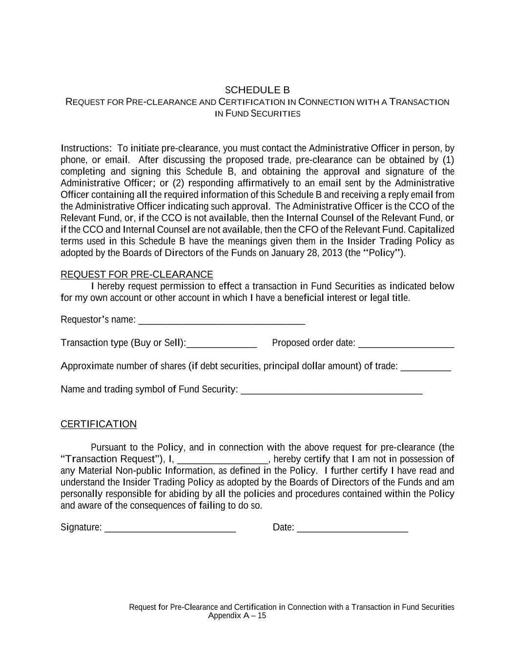 Request for Pre-Clearance and Certification in Connection with a Transaction in Fund Securities Appendix A – 15 SCHEDULE B REQUEST FOR PRE-CLEARANCE AND CERTIFICATION IN CONNECTION WITH A TRANSACTION IN FUND SECURITIES Instructions: To initiate pre-clearance, you must contact the Administrative Officer in person, by phone, or email. After discussing the proposed trade, pre-clearance can be obtained by (1) completing and signing this Schedule B, and obtaining the approval and signature of the Administrative Officer; or (2) responding affirmatively to an email sent by the Administrative Officer containing all the required information of this Schedule B and receiving a reply email from the Administrative Officer indicating such approval. The Administrative Officer is the CCO of the Relevant Fund, or, if the CCO is not available, then the Internal Counsel of the Relevant Fund, or if the CCO and Internal Counsel are not available, then the CFO of the Relevant Fund. Capitalized terms used in this Schedule B have the meanings given them in the Insider Trading Policy as adopted by the Boards of Directors of the Funds on January 28, 2013 (the “Policy”). REQUEST FOR PRE-CLEARANCE I hereby request permission to effect a transaction in Fund Securities as indicated below for my own account or other account in which I have a beneficial interest or legal title. Requestor’s name: _________________________________ Transaction type (Buy or Sell):______________ Proposed order date: ___________________ Approximate number of shares (if debt securities, principal dollar amount) of trade: __________ Name and trading symbol of Fund Security: ____________________________________ CERTIFICATION Pursuant to the Policy, and in connection with the above request for pre-clearance (the “Transaction Request”), I, __________________, hereby certify that I am not in possession of any Material Non-public Information, as defined in the Policy. I further certify I have read and understand the Insider Trading Policy as adopted by the Boards of Directors of the Funds and am personally responsible for abiding by all the policies and procedures contained within the Policy and aware of the consequences of failing to do so. Signature: __________________________ Date: ______________________