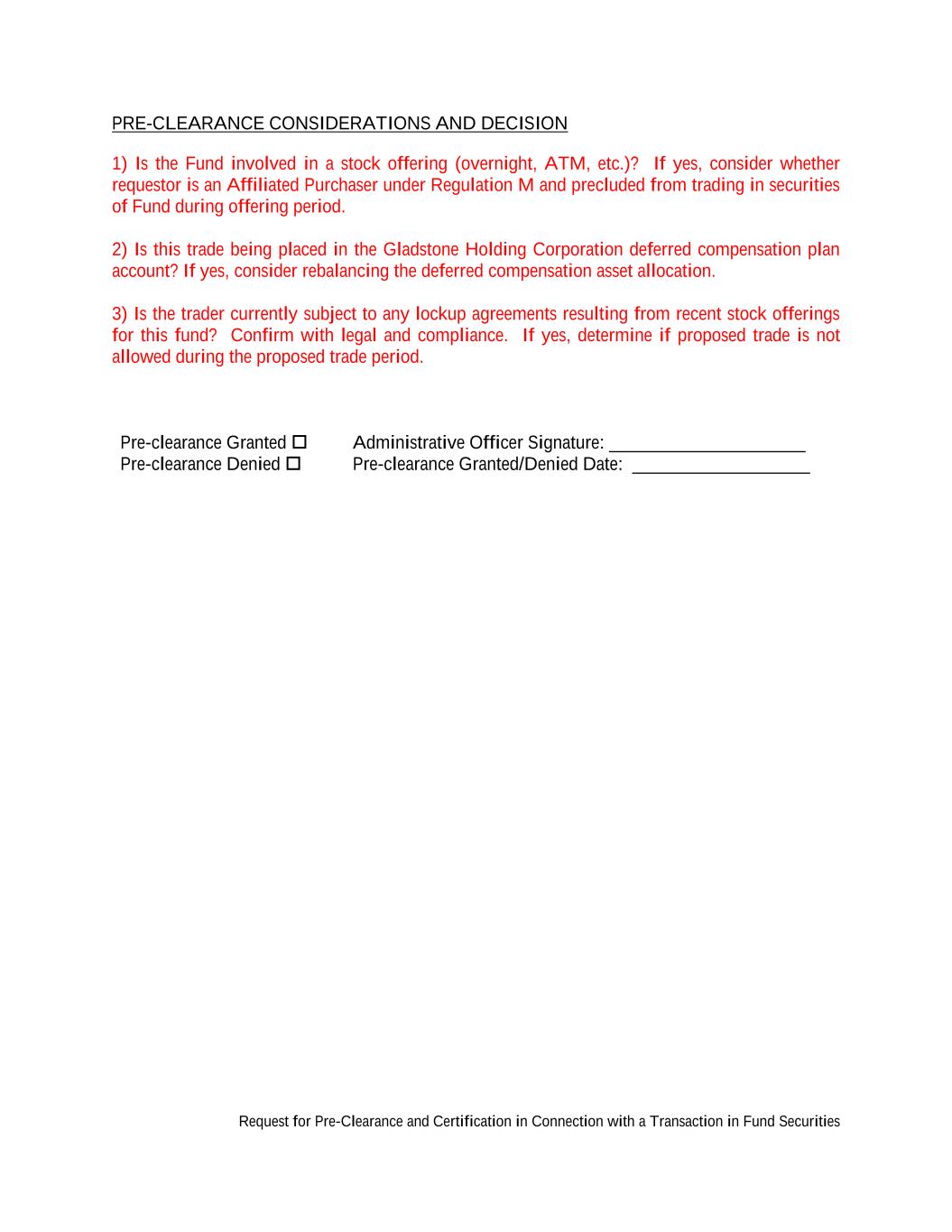 Request for Pre-Clearance and Certification in Connection with a Transaction in Fund Securities PRE-CLEARANCE CONSIDERATIONS AND DECISION 1) Is the Fund involved in a stock offering (overnight, ATM, etc.)? If yes, consider whether requestor is an Affiliated Purchaser under Regulation M and precluded from trading in securities of Fund during offering period. 2) Is this trade being placed in the Gladstone Holding Corporation deferred compensation plan account? If yes, consider rebalancing the deferred compensation asset allocation. 3) Is the trader currently subject to any lockup agreements resulting from recent stock offerings for this fund? Confirm with legal and compliance. If yes, determine if proposed trade is not allowed during the proposed trade period. Pre-clearance Granted Pre-clearance Denied Administrative Officer Signature: _____________________ Pre-clearance Granted/Denied Date: ___________________