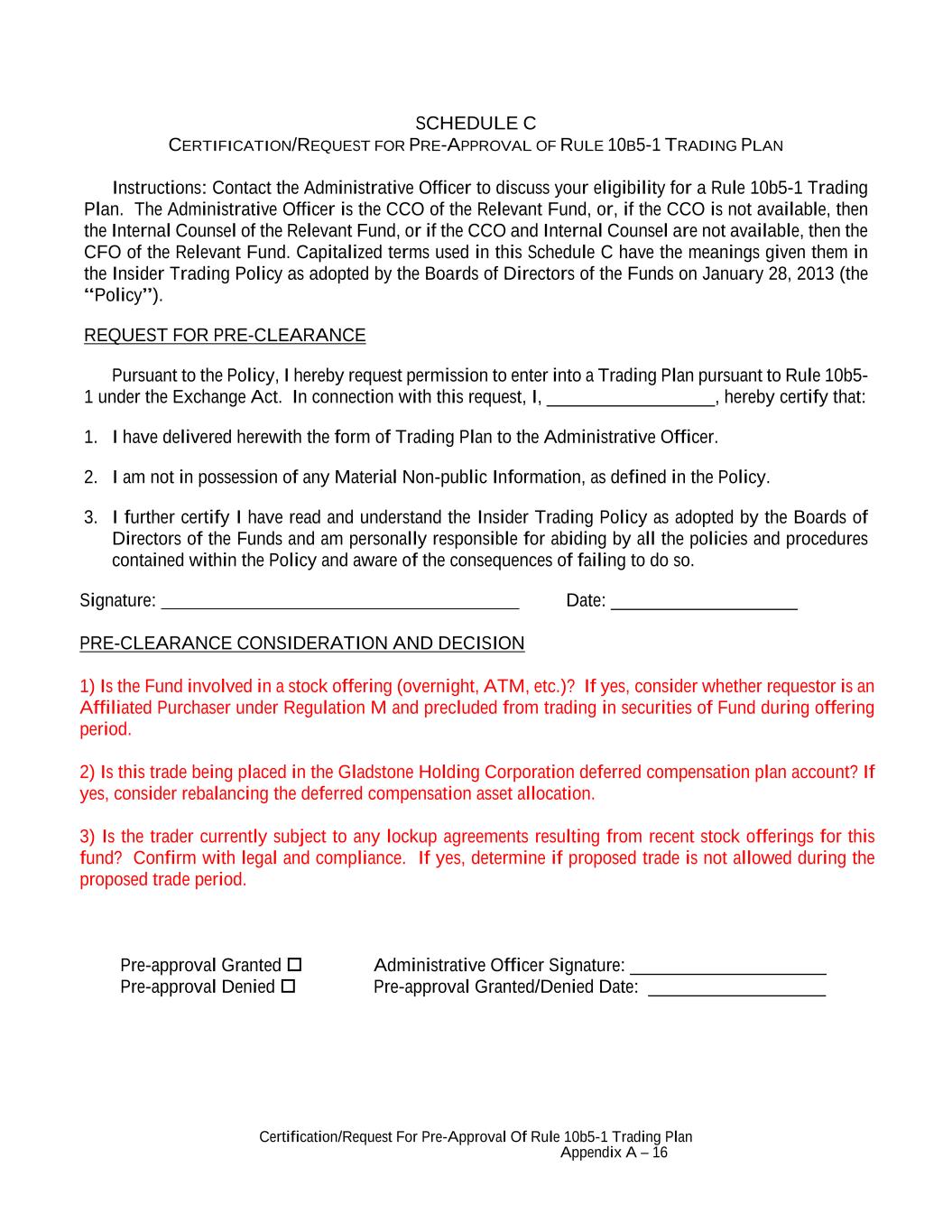 Certification/Request For Pre-Approval Of Rule 10b5-1 Trading Plan Appendix A – 16 SCHEDULE C CERTIFICATION/REQUEST FOR PRE-APPROVAL OF RULE 10B5-1 TRADING PLAN Instructions: Contact the Administrative Officer to discuss your eligibility for a Rule 10b5-1 Trading Plan. The Administrative Officer is the CCO of the Relevant Fund, or, if the CCO is not available, then the Internal Counsel of the Relevant Fund, or if the CCO and Internal Counsel are not available, then the CFO of the Relevant Fund. Capitalized terms used in this Schedule C have the meanings given them in the Insider Trading Policy as adopted by the Boards of Directors of the Funds on January 28, 2013 (the “Policy”). REQUEST FOR PRE-CLEARANCE Pursuant to the Policy, I hereby request permission to enter into a Trading Plan pursuant to Rule 10b5- 1 under the Exchange Act. In connection with this request, I, __________________, hereby certify that: 1. I have delivered herewith the form of Trading Plan to the Administrative Officer. 2. I am not in possession of any Material Non-public Information, as defined in the Policy. 3. I further certify I have read and understand the Insider Trading Policy as adopted by the Boards of Directors of the Funds and am personally responsible for abiding by all the policies and procedures contained within the Policy and aware of the consequences of failing to do so. Signature: Date: ____________________ PRE-CLEARANCE CONSIDERATION AND DECISION 1) Is the Fund involved in a stock offering (overnight, ATM, etc.)? If yes, consider whether requestor is an Affiliated Purchaser under Regulation M and precluded from trading in securities of Fund during offering period. 2) Is this trade being placed in the Gladstone Holding Corporation deferred compensation plan account? If yes, consider rebalancing the deferred compensation asset allocation. 3) Is the trader currently subject to any lockup agreements resulting from recent stock offerings for this fund? Confirm with legal and compliance. If yes, determine if proposed trade is not allowed during the proposed trade period. Pre-approval Granted Pre-approval Denied Administrative Officer Signature: _____________________ Pre-approval Granted/Denied Date: ___________________