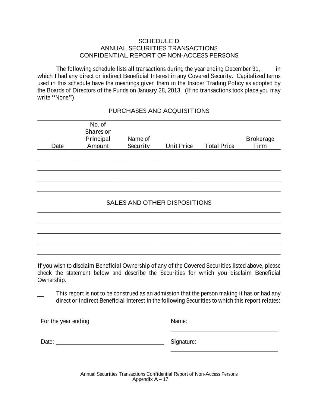 Annual Securities Transactions Confidential Report of Non-Access Persons Appendix A – 17 SCHEDULE D ANNUAL SECURITIES TRANSACTIONS CONFIDENTIAL REPORT OF NON-ACCESS PERSONS The following schedule lists all transactions during the year ending December 31, ____ in which I had any direct or indirect Beneficial Interest in any Covered Security. Capitalized terms used in this schedule have the meanings given them in the Insider Trading Policy as adopted by the Boards of Directors of the Funds on January 28, 2013. (If no transactions took place you may write “None”) PURCHASES AND ACQUISITIONS Date No. of Shares or Principal Amount Name of Security Unit Price Total Price Brokerage Firm SALES AND OTHER DISPOSITIONS If you wish to disclaim Beneficial Ownership of any of the Covered Securities listed above, please check the statement below and describe the Securities for which you disclaim Beneficial Ownership. __ This report is not to be construed as an admission that the person making it has or had any direct or indirect Beneficial Interest in the following Securities to which this report relates: For the year ending Name: Date: Signature:
