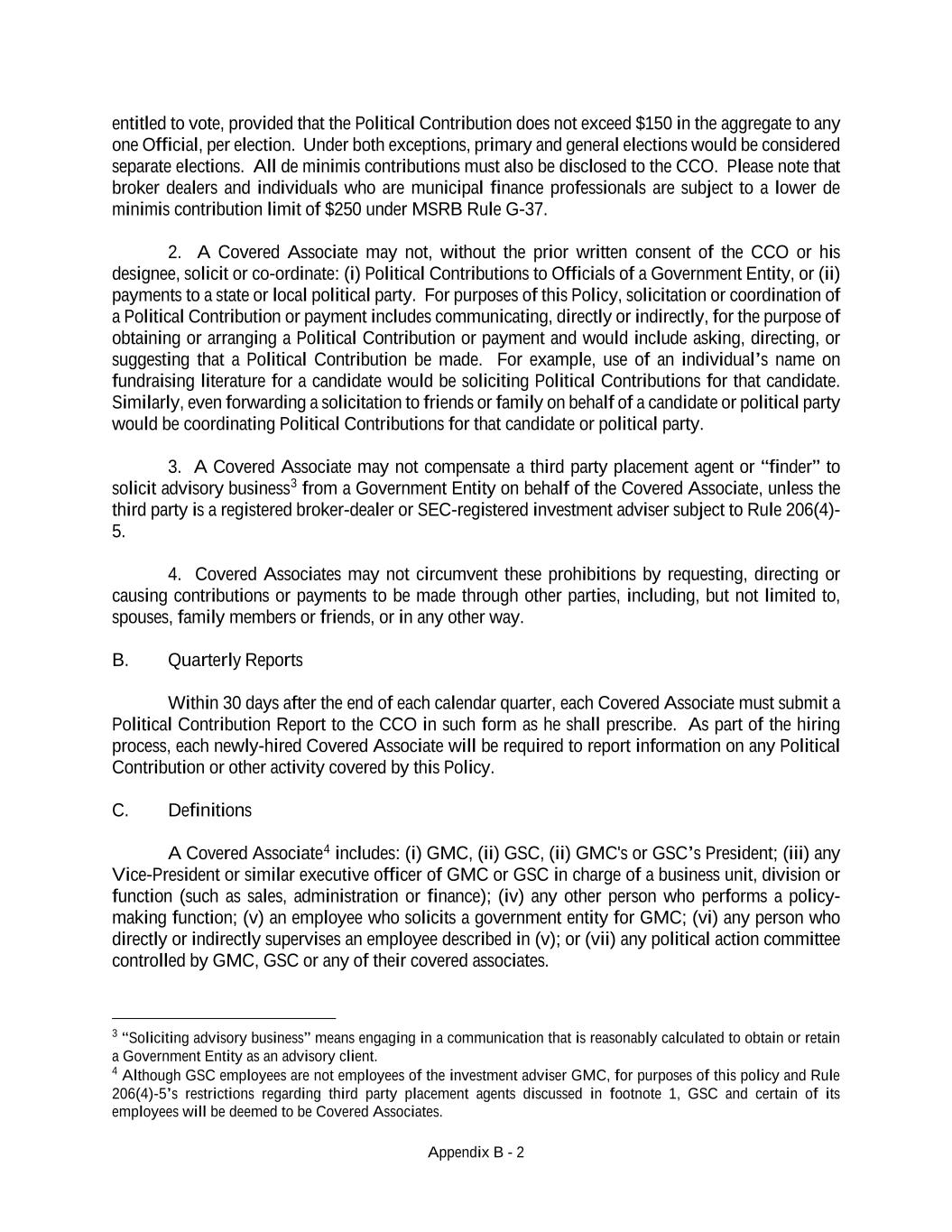 Appendix B - 2 entitled to vote, provided that the Political Contribution does not exceed $150 in the aggregate to any one Official, per election. Under both exceptions, primary and general elections would be considered separate elections. All de minimis contributions must also be disclosed to the CCO. Please note that broker dealers and individuals who are municipal finance professionals are subject to a lower de minimis contribution limit of $250 under MSRB Rule G-37. 2. A Covered Associate may not, without the prior written consent of the CCO or his designee, solicit or co-ordinate: (i) Political Contributions to Officials of a Government Entity, or (ii) payments to a state or local political party. For purposes of this Policy, solicitation or coordination of a Political Contribution or payment includes communicating, directly or indirectly, for the purpose of obtaining or arranging a Political Contribution or payment and would include asking, directing, or suggesting that a Political Contribution be made. For example, use of an individual’s name on fundraising literature for a candidate would be soliciting Political Contributions for that candidate. Similarly, even forwarding a solicitation to friends or family on behalf of a candidate or political party would be coordinating Political Contributions for that candidate or political party. 3. A Covered Associate may not compensate a third party placement agent or “finder” to solicit advisory business3 from a Government Entity on behalf of the Covered Associate, unless the third party is a registered broker-dealer or SEC-registered investment adviser subject to Rule 206(4)- 5. 4. Covered Associates may not circumvent these prohibitions by requesting, directing or causing contributions or payments to be made through other parties, including, but not limited to, spouses, family members or friends, or in any other way. B. Quarterly Reports Within 30 days after the end of each calendar quarter, each Covered Associate must submit a Political Contribution Report to the CCO in such form as he shall prescribe. As part of the hiring process, each newly-hired Covered Associate will be required to report information on any Political Contribution or other activity covered by this Policy. C. Definitions A Covered Associate4 includes: (i) GMC, (ii) GSC, (ii) GMC's or GSC’s President; (iii) any Vice-President or similar executive officer of GMC or GSC in charge of a business unit, division or function (such as sales, administration or finance); (iv) any other person who performs a policy- making function; (v) an employee who solicits a government entity for GMC; (vi) any person who directly or indirectly supervises an employee described in (v); or (vii) any political action committee controlled by GMC, GSC or any of their covered associates. 3 “Soliciting advisory business” means engaging in a communication that is reasonably calculated to obtain or retain a Government Entity as an advisory client. 4 Although GSC employees are not employees of the investment adviser GMC, for purposes of this policy and Rule 206(4)-5’s restrictions regarding third party placement agents discussed in footnote 1, GSC and certain of its employees will be deemed to be Covered Associates.