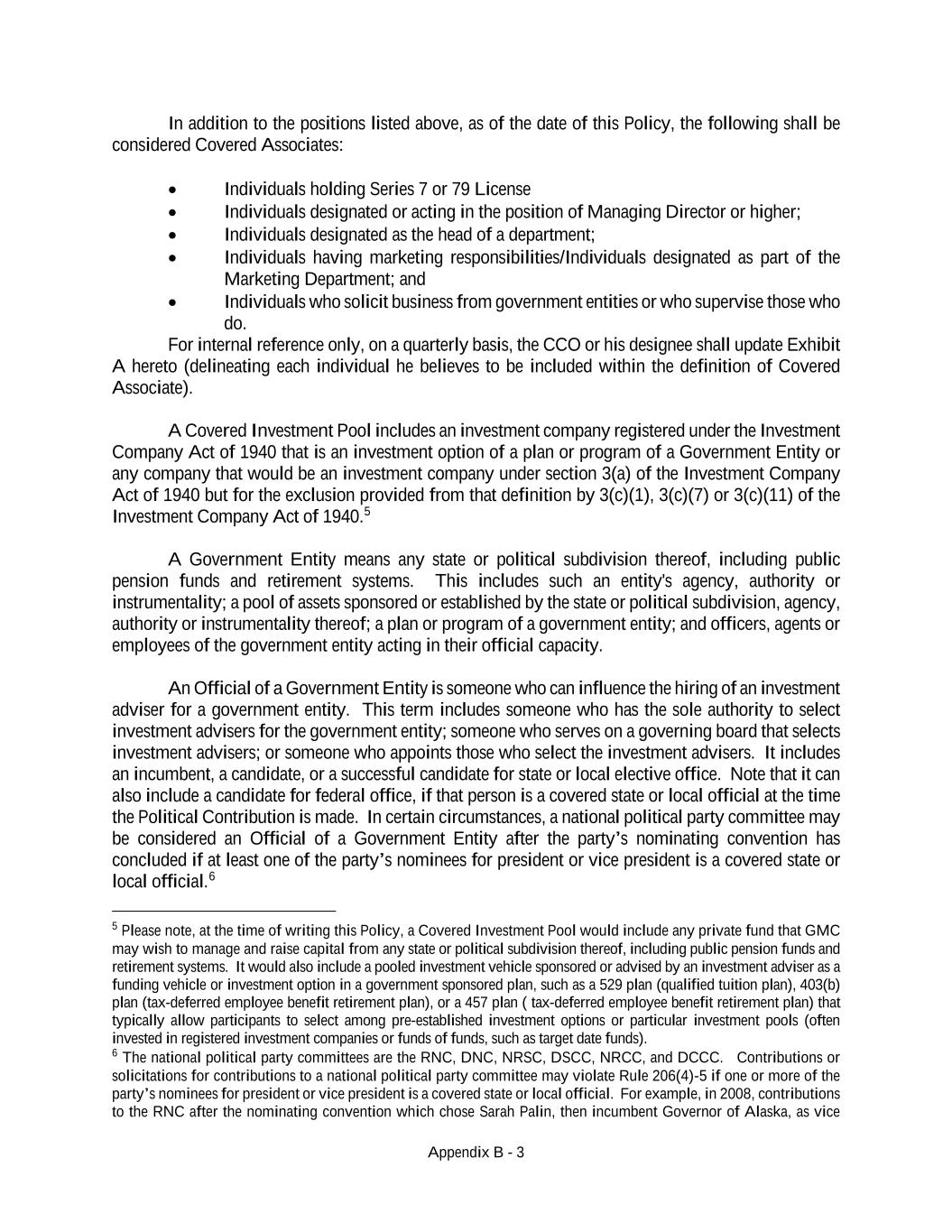 Appendix B - 3 In addition to the positions listed above, as of the date of this Policy, the following shall be considered Covered Associates: • Individuals holding Series 7 or 79 License • Individuals designated or acting in the position of Managing Director or higher; • Individuals designated as the head of a department; • Individuals having marketing responsibilities/Individuals designated as part of the Marketing Department; and • Individuals who solicit business from government entities or who supervise those who do. For internal reference only, on a quarterly basis, the CCO or his designee shall update Exhibit A hereto (delineating each individual he believes to be included within the definition of Covered Associate). A Covered Investment Pool includes an investment company registered under the Investment Company Act of 1940 that is an investment option of a plan or program of a Government Entity or any company that would be an investment company under section 3(a) of the Investment Company Act of 1940 but for the exclusion provided from that definition by 3(c)(1), 3(c)(7) or 3(c)(11) of the Investment Company Act of 1940.5 A Government Entity means any state or political subdivision thereof, including public pension funds and retirement systems. This includes such an entity's agency, authority or instrumentality; a pool of assets sponsored or established by the state or political subdivision, agency, authority or instrumentality thereof; a plan or program of a government entity; and officers, agents or employees of the government entity acting in their official capacity. An Official of a Government Entity is someone who can influence the hiring of an investment adviser for a government entity. This term includes someone who has the sole authority to select investment advisers for the government entity; someone who serves on a governing board that selects investment advisers; or someone who appoints those who select the investment advisers. It includes an incumbent, a candidate, or a successful candidate for state or local elective office. Note that it can also include a candidate for federal office, if that person is a covered state or local official at the time the Political Contribution is made. In certain circumstances, a national political party committee may be considered an Official of a Government Entity after the party’s nominating convention has concluded if at least one of the party’s nominees for president or vice president is a covered state or local official.6 5 Please note, at the time of writing this Policy, a Covered Investment Pool would include any private fund that GMC may wish to manage and raise capital from any state or political subdivision thereof, including public pension funds and retirement systems. It would also include a pooled investment vehicle sponsored or advised by an investment adviser as a funding vehicle or investment option in a government sponsored plan, such as a 529 plan (qualified tuition plan), 403(b) plan (tax-deferred employee benefit retirement plan), or a 457 plan ( tax-deferred employee benefit retirement plan) that typically allow participants to select among pre-established investment options or particular investment pools (often invested in registered investment companies or funds of funds, such as target date funds). 6 The national political party committees are the RNC, DNC, NRSC, DSCC, NRCC, and DCCC. Contributions or solicitations for contributions to a national political party committee may violate Rule 206(4)-5 if one or more of the party’s nominees for president or vice president is a covered state or local official. For example, in 2008, contributions to the RNC after the nominating convention which chose Sarah Palin, then incumbent Governor of Alaska, as vice