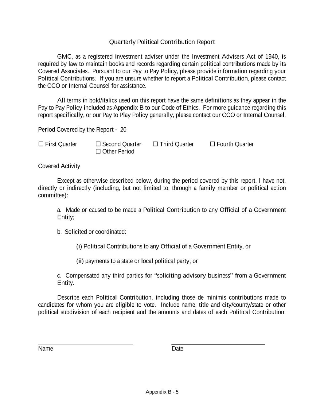 Appendix B - 5 Quarterly Political Contribution Report GMC, as a registered investment adviser under the Investment Advisers Act of 1940, is required by law to maintain books and records regarding certain political contributions made by its Covered Associates. Pursuant to our Pay to Pay Policy, please provide information regarding your Political Contributions. If you are unsure whether to report a Political Contribution, please contact the CCO or Internal Counsel for assistance. All terms in bold/italics used on this report have the same definitions as they appear in the Pay to Pay Policy included as Appendix B to our Code of Ethics. For more guidance regarding this report specifically, or our Pay to Play Policy generally, please contact our CCO or Internal Counsel. Period Covered by the Report - 20 First Quarter Second Quarter Third Quarter Fourth Quarter Other Period Covered Activity Except as otherwise described below, during the period covered by this report, I have not, directly or indirectly (including, but not limited to, through a family member or political action committee): a. Made or caused to be made a Political Contribution to any Official of a Government Entity; b. Solicited or coordinated: (i) Political Contributions to any Official of a Government Entity, or (ii) payments to a state or local political party; or c. Compensated any third parties for “soliciting advisory business” from a Government Entity. Describe each Political Contribution, including those de minimis contributions made to candidates for whom you are eligible to vote. Include name, title and city/county/state or other political subdivision of each recipient and the amounts and dates of each Political Contribution: ______________________________ Name Date