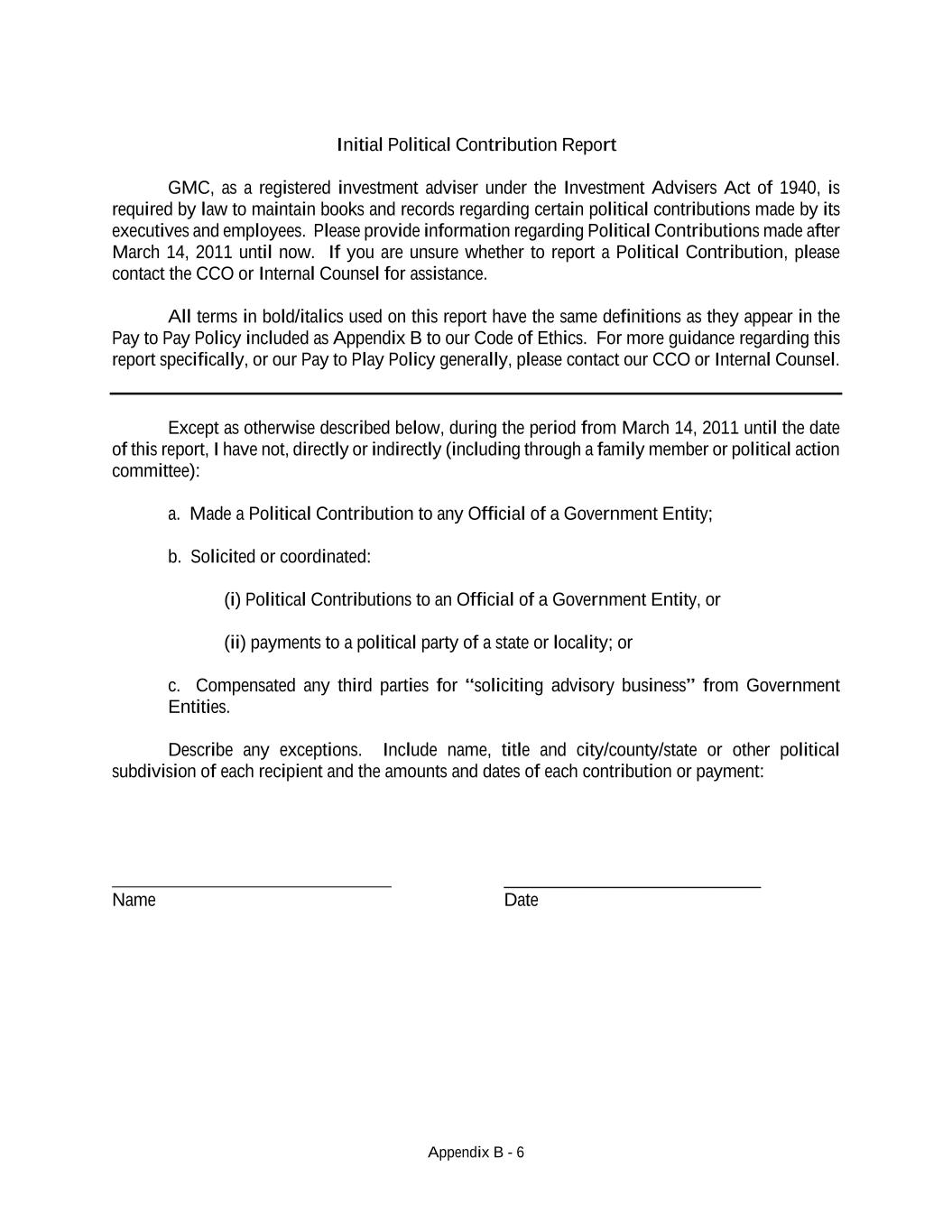Appendix B - 6 Initial Political Contribution Report GMC, as a registered investment adviser under the Investment Advisers Act of 1940, is required by law to maintain books and records regarding certain political contributions made by its executives and employees. Please provide information regarding Political Contributions made after March 14, 2011 until now. If you are unsure whether to report a Political Contribution, please contact the CCO or Internal Counsel for assistance. All terms in bold/italics used on this report have the same definitions as they appear in the Pay to Pay Policy included as Appendix B to our Code of Ethics. For more guidance regarding this report specifically, or our Pay to Play Policy generally, please contact our CCO or Internal Counsel. Except as otherwise described below, during the period from March 14, 2011 until the date of this report, I have not, directly or indirectly (including through a family member or political action committee): a. Made a Political Contribution to any Official of a Government Entity; b. Solicited or coordinated: (i) Political Contributions to an Official of a Government Entity, or (ii) payments to a political party of a state or locality; or c. Compensated any third parties for “soliciting advisory business” from Government Entities. Describe any exceptions. Include name, title and city/county/state or other political subdivision of each recipient and the amounts and dates of each contribution or payment: ____________________________ Name Date