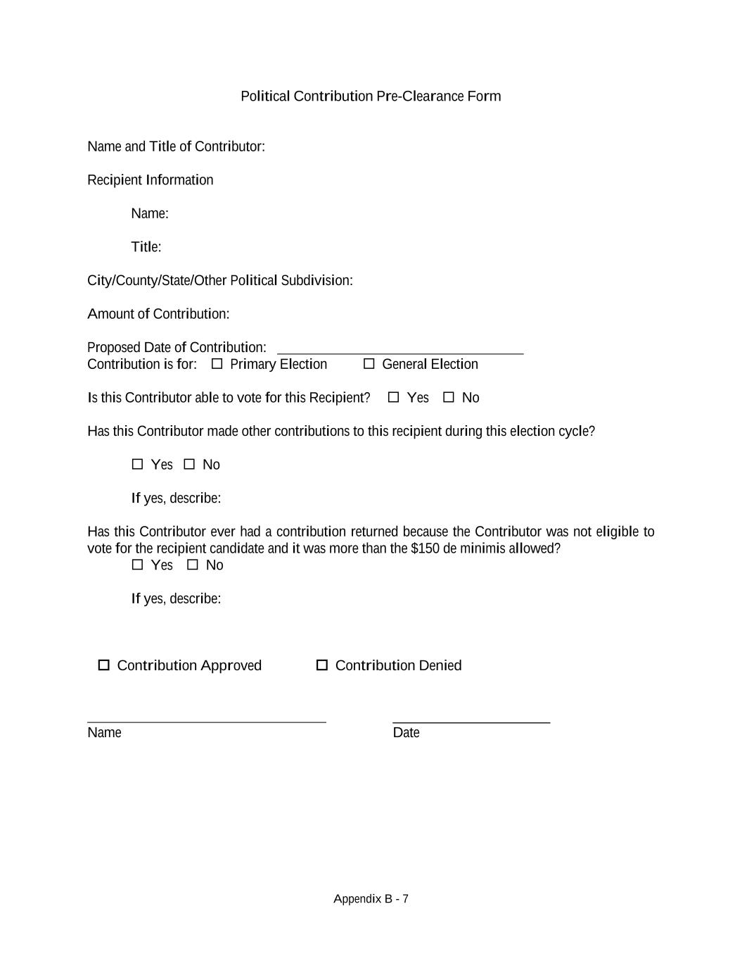 Appendix B - 7 Political Contribution Pre-Clearance Form Name and Title of Contributor: Recipient Information Name: Title: City/County/State/Other Political Subdivision: Amount of Contribution: Proposed Date of Contribution: Contribution is for: Primary Election General Election Is this Contributor able to vote for this Recipient? Yes No Has this Contributor made other contributions to this recipient during this election cycle? Yes No If yes, describe: Has this Contributor ever had a contribution returned because the Contributor was not eligible to vote for the recipient candidate and it was more than the $150 de minimis allowed? Yes No If yes, describe: Contribution Approved Contribution Denied ______________________ Name Date