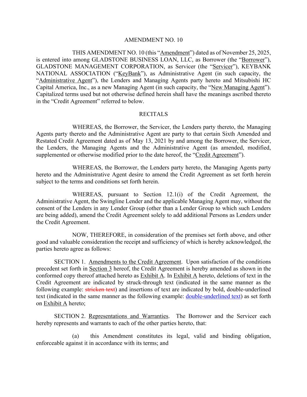 AMENDMENT NO. 10 THIS AMENDMENT NO. 10 (this “Amendment”) dated as of November 25, 2025, is entered into among GLADSTONE BUSINESS LOAN, LLC, as Borrower (the “Borrower”), GLADSTONE MANAGEMENT CORPORATION, as Servicer (the “Servicer”), KEYBANK NATIONAL ASSOCIATION (“KeyBank”), as Administrative Agent (in such capacity, the “Administrative Agent”), the Lenders and Managing Agents party hereto and Mitsubishi HC Capital America, Inc., as a new Managing Agent (in such capacity, the “New Managing Agent”). Capitalized terms used but not otherwise defined herein shall have the meanings ascribed thereto in the “Credit Agreement” referred to below. RECITALS WHEREAS, the Borrower, the Servicer, the Lenders party thereto, the Managing Agents party thereto and the Administrative Agent are party to that certain Sixth Amended and Restated Credit Agreement dated as of May 13, 2021 by and among the Borrower, the Servicer, the Lenders, the Managing Agents and the Administrative Agent (as amended, modified, supplemented or otherwise modified prior to the date hereof, the “Credit Agreement”). WHEREAS, the Borrower, the Lenders party hereto, the Managing Agents party hereto and the Administrative Agent desire to amend the Credit Agreement as set forth herein subject to the terms and conditions set forth herein. WHEREAS, pursuant to Section 12.1(i) of the Credit Agreement, the Administrative Agent, the Swingline Lender and the applicable Managing Agent may, without the consent of the Lenders in any Lender Group (other than a Lender Group to which such Lenders are being added), amend the Credit Agreement solely to add additional Persons as Lenders under the Credit Agreement. NOW, THEREFORE, in consideration of the premises set forth above, and other good and valuable consideration the receipt and sufficiency of which is hereby acknowledged, the parties hereto agree as follows: SECTION 1. Amendments to the Credit Agreement. Upon satisfaction of the conditions precedent set forth in Section 3 hereof, the Credit Agreement is hereby amended as shown in the conformed copy thereof attached hereto as Exhibit A. In Exhibit A hereto, deletions of text in the Credit Agreement are indicated by struck-through text (indicated in the same manner as the following example: stricken text) and insertions of text are indicated by bold, double-underlined text (indicated in the same manner as the following example: double-underlined text) as set forth on Exhibit A hereto; SECTION 2. Representations and Warranties. The Borrower and the Servicer each hereby represents and warrants to each of the other parties hereto, that: (a) this Amendment constitutes its legal, valid and binding obligation, enforceable against it in accordance with its terms; and