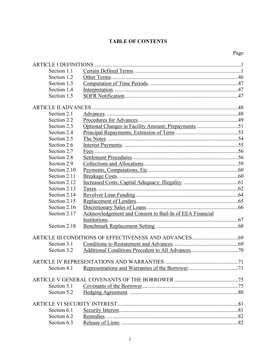 i TABLE OF CONTENTS Page ARTICLE I DEFINITIONS ............................................................................................................1 Section 1.1 Certain Defined Terms. ..............................................................................1 Section 1.2 Other Terms. .............................................................................................46 Section 1.3 Computation of Time Periods. .................................................................47 Section 1.4 Interpretation. ...........................................................................................47 Section 1.5 SOFR Notification. ...................................................................................47 ARTICLE II ADVANCES ............................................................................................................48 Section 2.1 Advances. .................................................................................................48 Section 2.2 Procedures for Advances. .........................................................................49 Section 2.3 Optional Changes in Facility Amount; Prepayments. ..............................51 Section 2.4 Principal Repayments; Extension of Term. ..............................................53 Section 2.5 The Notes. ................................................................................................54 Section 2.6 Interest Payments. ....................................................................................55 Section 2.7 Fees. ..........................................................................................................56 Section 2.8 Settlement Procedures. .............................................................................56 Section 2.9 Collections and Allocations. .....................................................................59 Section 2.10 Payments, Computations, Etc. ..................................................................60 Section 2.11 Breakage Costs. ........................................................................................60 Section 2.12 Increased Costs; Capital Adequacy; Illegality. ........................................61 Section 2.13 Taxes. .......................................................................................................62 Section 2.14 Revolver Loan Funding. ...........................................................................64 Section 2.15 Replacement of Lenders. ..........................................................................65 Section 2.16 Discretionary Sales of Loans. ...................................................................66 Section 2.17 Acknowledgement and Consent to Bail-In of EEA Financial Institutions. ...............................................................................................67 Section 2.18 Benchmark Replacement Setting. ............................................................68 ARTICLE III CONDITIONS OF EFFECTIVENESS AND ADVANCES ..................................69 Section 3.1 Conditions to Restatement and Advances. ...............................................69 Section 3.2 Additional Conditions Precedent to All Advances. ..................................70 ARTICLE IV REPRESENTATIONS AND WARRANTIES ......................................................71 Section 4.1 Representations and Warranties of the Borrower. ....................................71 ARTICLE V GENERAL COVENANTS OF THE BORROWER ...............................................75 Section 5.1 Covenants of the Borrower. ......................................................................75 Section 5.2 Hedging Agreement. ................................................................................80 ARTICLE VI SECURITY INTEREST .........................................................................................81 Section 6.1 Security Interest. .......................................................................................81 Section 6.2 Remedies. .................................................................................................82 Section 6.3 Release of Liens. ......................................................................................82