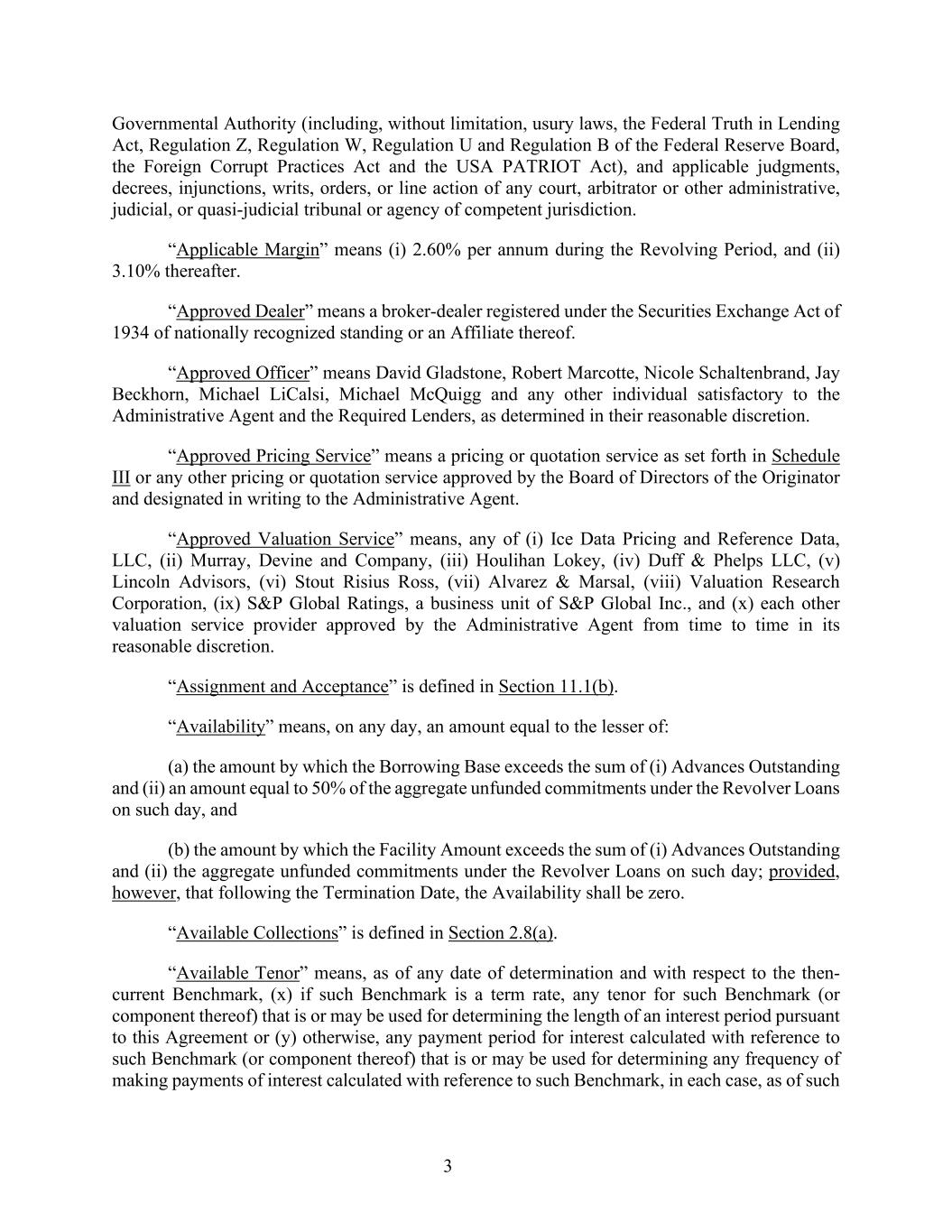 3 Governmental Authority (including, without limitation, usury laws, the Federal Truth in Lending Act, Regulation Z, Regulation W, Regulation U and Regulation B of the Federal Reserve Board, the Foreign Corrupt Practices Act and the USA PATRIOT Act), and applicable judgments, decrees, injunctions, writs, orders, or line action of any court, arbitrator or other administrative, judicial, or quasi-judicial tribunal or agency of competent jurisdiction. “Applicable Margin” means (i) 2.60% per annum during the Revolving Period, and (ii) 3.10% thereafter. “Approved Dealer” means a broker-dealer registered under the Securities Exchange Act of 1934 of nationally recognized standing or an Affiliate thereof. “Approved Officer” means David Gladstone, Robert Marcotte, Nicole Schaltenbrand, Jay Beckhorn, Michael LiCalsi, Michael McQuigg and any other individual satisfactory to the Administrative Agent and the Required Lenders, as determined in their reasonable discretion. “Approved Pricing Service” means a pricing or quotation service as set forth in Schedule III or any other pricing or quotation service approved by the Board of Directors of the Originator and designated in writing to the Administrative Agent. “Approved Valuation Service” means, any of (i) Ice Data Pricing and Reference Data, LLC, (ii) Murray, Devine and Company, (iii) Houlihan Lokey, (iv) Duff & Phelps LLC, (v) Lincoln Advisors, (vi) Stout Risius Ross, (vii) Alvarez & Marsal, (viii) Valuation Research Corporation, (ix) S&P Global Ratings, a business unit of S&P Global Inc., and (x) each other valuation service provider approved by the Administrative Agent from time to time in its reasonable discretion. “Assignment and Acceptance” is defined in Section 11.1(b). “Availability” means, on any day, an amount equal to the lesser of: (a) the amount by which the Borrowing Base exceeds the sum of (i) Advances Outstanding and (ii) an amount equal to 50% of the aggregate unfunded commitments under the Revolver Loans on such day, and (b) the amount by which the Facility Amount exceeds the sum of (i) Advances Outstanding and (ii) the aggregate unfunded commitments under the Revolver Loans on such day; provided, however, that following the Termination Date, the Availability shall be zero. “Available Collections” is defined in Section 2.8(a). “Available Tenor” means, as of any date of determination and with respect to the then- current Benchmark, (x) if such Benchmark is a term rate, any tenor for such Benchmark (or component thereof) that is or may be used for determining the length of an interest period pursuant to this Agreement or (y) otherwise, any payment period for interest calculated with reference to such Benchmark (or component thereof) that is or may be used for determining any frequency of making payments of interest calculated with reference to such Benchmark, in each case, as of such