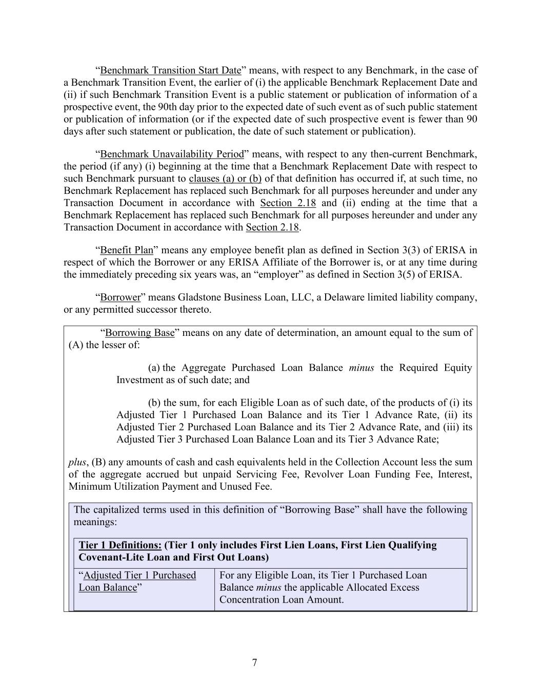 7 “Benchmark Transition Start Date” means, with respect to any Benchmark, in the case of a Benchmark Transition Event, the earlier of (i) the applicable Benchmark Replacement Date and (ii) if such Benchmark Transition Event is a public statement or publication of information of a prospective event, the 90th day prior to the expected date of such event as of such public statement or publication of information (or if the expected date of such prospective event is fewer than 90 days after such statement or publication, the date of such statement or publication). “Benchmark Unavailability Period” means, with respect to any then-current Benchmark, the period (if any) (i) beginning at the time that a Benchmark Replacement Date with respect to such Benchmark pursuant to clauses (a) or (b) of that definition has occurred if, at such time, no Benchmark Replacement has replaced such Benchmark for all purposes hereunder and under any Transaction Document in accordance with Section 2.18 and (ii) ending at the time that a Benchmark Replacement has replaced such Benchmark for all purposes hereunder and under any Transaction Document in accordance with Section 2.18. “Benefit Plan” means any employee benefit plan as defined in Section 3(3) of ERISA in respect of which the Borrower or any ERISA Affiliate of the Borrower is, or at any time during the immediately preceding six years was, an “employer” as defined in Section 3(5) of ERISA. “Borrower” means Gladstone Business Loan, LLC, a Delaware limited liability company, or any permitted successor thereto. “Borrowing Base” means on any date of determination, an amount equal to the sum of (A) the lesser of: (a) the Aggregate Purchased Loan Balance minus the Required Equity Investment as of such date; and (b) the sum, for each Eligible Loan as of such date, of the products of (i) its Adjusted Tier 1 Purchased Loan Balance and its Tier 1 Advance Rate, (ii) its Adjusted Tier 2 Purchased Loan Balance and its Tier 2 Advance Rate, and (iii) its Adjusted Tier 3 Purchased Loan Balance Loan and its Tier 3 Advance Rate; plus, (B) any amounts of cash and cash equivalents held in the Collection Account less the sum of the aggregate accrued but unpaid Servicing Fee, Revolver Loan Funding Fee, Interest, Minimum Utilization Payment and Unused Fee. The capitalized terms used in this definition of “Borrowing Base” shall have the following meanings: Tier 1 Definitions: (Tier 1 only includes First Lien Loans, First Lien Qualifying Covenant-Lite Loan and First Out Loans) “Adjusted Tier 1 Purchased Loan Balance” For any Eligible Loan, its Tier 1 Purchased Loan Balance minus the applicable Allocated Excess Concentration Loan Amount.