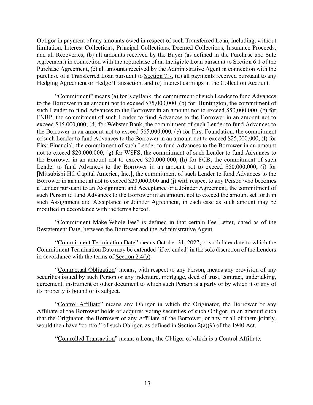 13 Obligor in payment of any amounts owed in respect of such Transferred Loan, including, without limitation, Interest Collections, Principal Collections, Deemed Collections, Insurance Proceeds, and all Recoveries, (b) all amounts received by the Buyer (as defined in the Purchase and Sale Agreement) in connection with the repurchase of an Ineligible Loan pursuant to Section 6.1 of the Purchase Agreement, (c) all amounts received by the Administrative Agent in connection with the purchase of a Transferred Loan pursuant to Section 7.7, (d) all payments received pursuant to any Hedging Agreement or Hedge Transaction, and (e) interest earnings in the Collection Account. “Commitment” means (a) for KeyBank, the commitment of such Lender to fund Advances to the Borrower in an amount not to exceed $75,000,000, (b) for Huntington, the commitment of such Lender to fund Advances to the Borrower in an amount not to exceed $50,000,000, (c) for FNBP, the commitment of such Lender to fund Advances to the Borrower in an amount not to exceed $15,000,000, (d) for Webster Bank, the commitment of such Lender to fund Advances to the Borrower in an amount not to exceed $65,000,000, (e) for First Foundation, the commitment of such Lender to fund Advances to the Borrower in an amount not to exceed $25,000,000, (f) for First Financial, the commitment of such Lender to fund Advances to the Borrower in an amount not to exceed $20,000,000, (g) for WSFS, the commitment of such Lender to fund Advances to the Borrower in an amount not to exceed $20,000,000, (h) for FCB, the commitment of such Lender to fund Advances to the Borrower in an amount not to exceed $50,000,000, (i) for [Mitsubishi HC Capital America, Inc.], the commitment of such Lender to fund Advances to the Borrower in an amount not to exceed $20,000,000 and (j) with respect to any Person who becomes a Lender pursuant to an Assignment and Acceptance or a Joinder Agreement, the commitment of such Person to fund Advances to the Borrower in an amount not to exceed the amount set forth in such Assignment and Acceptance or Joinder Agreement, in each case as such amount may be modified in accordance with the terms hereof. “Commitment Make-Whole Fee” is defined in that certain Fee Letter, dated as of the Restatement Date, between the Borrower and the Administrative Agent. “Commitment Termination Date” means October 31, 2027, or such later date to which the Commitment Termination Date may be extended (if extended) in the sole discretion of the Lenders in accordance with the terms of Section 2.4(b). “Contractual Obligation” means, with respect to any Person, means any provision of any securities issued by such Person or any indenture, mortgage, deed of trust, contract, undertaking, agreement, instrument or other document to which such Person is a party or by which it or any of its property is bound or is subject. “Control Affiliate” means any Obligor in which the Originator, the Borrower or any Affiliate of the Borrower holds or acquires voting securities of such Obligor, in an amount such that the Originator, the Borrower or any Affiliate of the Borrower, or any or all of them jointly, would then have “control” of such Obligor, as defined in Section 2(a)(9) of the 1940 Act. “Controlled Transaction” means a Loan, the Obligor of which is a Control Affiliate.