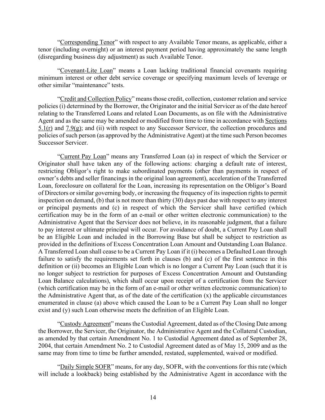 14 “Corresponding Tenor” with respect to any Available Tenor means, as applicable, either a tenor (including overnight) or an interest payment period having approximately the same length (disregarding business day adjustment) as such Available Tenor. “Covenant-Lite Loan” means a Loan lacking traditional financial covenants requiring minimum interest or other debt service coverage or specifying maximum levels of leverage or other similar “maintenance” tests. “Credit and Collection Policy” means those credit, collection, customer relation and service policies (i) determined by the Borrower, the Originator and the initial Servicer as of the date hereof relating to the Transferred Loans and related Loan Documents, as on file with the Administrative Agent and as the same may be amended or modified from time to time in accordance with Sections 5.1(r) and 7.9(g); and (ii) with respect to any Successor Servicer, the collection procedures and policies of such person (as approved by the Administrative Agent) at the time such Person becomes Successor Servicer. “Current Pay Loan” means any Transferred Loan (a) in respect of which the Servicer or Originator shall have taken any of the following actions: charging a default rate of interest, restricting Obligor’s right to make subordinated payments (other than payments in respect of owner’s debts and seller financings in the original loan agreement), acceleration of the Transferred Loan, foreclosure on collateral for the Loan, increasing its representation on the Obligor’s Board of Directors or similar governing body, or increasing the frequency of its inspection rights to permit inspection on demand, (b) that is not more than thirty (30) days past due with respect to any interest or principal payments and (c) in respect of which the Servicer shall have certified (which certification may be in the form of an e-mail or other written electronic communication) to the Administrative Agent that the Servicer does not believe, in its reasonable judgment, that a failure to pay interest or ultimate principal will occur. For avoidance of doubt, a Current Pay Loan shall be an Eligible Loan and included in the Borrowing Base but shall be subject to restriction as provided in the definitions of Excess Concentration Loan Amount and Outstanding Loan Balance. A Transferred Loan shall cease to be a Current Pay Loan if it (i) becomes a Defaulted Loan through failure to satisfy the requirements set forth in clauses (b) and (c) of the first sentence in this definition or (ii) becomes an Eligible Loan which is no longer a Current Pay Loan (such that it is no longer subject to restriction for purposes of Excess Concentration Amount and Outstanding Loan Balance calculations), which shall occur upon receipt of a certification from the Servicer (which certification may be in the form of an e-mail or other written electronic communication) to the Administrative Agent that, as of the date of the certification (x) the applicable circumstances enumerated in clause (a) above which caused the Loan to be a Current Pay Loan shall no longer exist and (y) such Loan otherwise meets the definition of an Eligible Loan. “Custody Agreement” means the Custodial Agreement, dated as of the Closing Date among the Borrower, the Servicer, the Originator, the Administrative Agent and the Collateral Custodian, as amended by that certain Amendment No. 1 to Custodial Agreement dated as of September 28, 2004, that certain Amendment No. 2 to Custodial Agreement dated as of May 15, 2009 and as the same may from time to time be further amended, restated, supplemented, waived or modified. “Daily Simple SOFR” means, for any day, SOFR, with the conventions for this rate (which will include a lookback) being established by the Administrative Agent in accordance with the