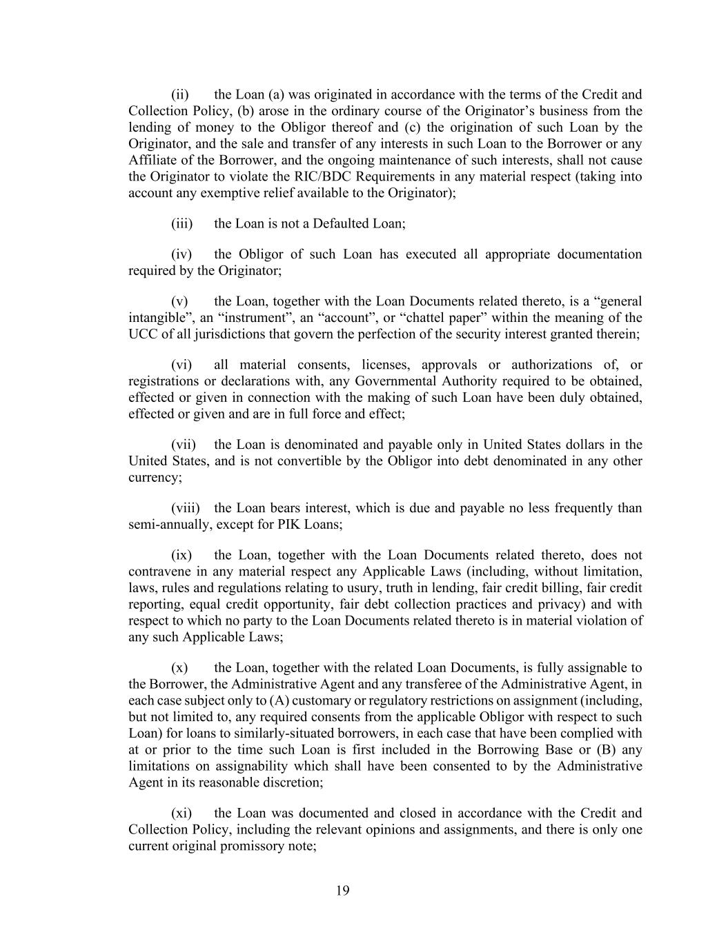19 (ii) the Loan (a) was originated in accordance with the terms of the Credit and Collection Policy, (b) arose in the ordinary course of the Originator’s business from the lending of money to the Obligor thereof and (c) the origination of such Loan by the Originator, and the sale and transfer of any interests in such Loan to the Borrower or any Affiliate of the Borrower, and the ongoing maintenance of such interests, shall not cause the Originator to violate the RIC/BDC Requirements in any material respect (taking into account any exemptive relief available to the Originator); (iii) the Loan is not a Defaulted Loan; (iv) the Obligor of such Loan has executed all appropriate documentation required by the Originator; (v) the Loan, together with the Loan Documents related thereto, is a “general intangible”, an “instrument”, an “account”, or “chattel paper” within the meaning of the UCC of all jurisdictions that govern the perfection of the security interest granted therein; (vi) all material consents, licenses, approvals or authorizations of, or registrations or declarations with, any Governmental Authority required to be obtained, effected or given in connection with the making of such Loan have been duly obtained, effected or given and are in full force and effect; (vii) the Loan is denominated and payable only in United States dollars in the United States, and is not convertible by the Obligor into debt denominated in any other currency; (viii) the Loan bears interest, which is due and payable no less frequently than semi-annually, except for PIK Loans; (ix) the Loan, together with the Loan Documents related thereto, does not contravene in any material respect any Applicable Laws (including, without limitation, laws, rules and regulations relating to usury, truth in lending, fair credit billing, fair credit reporting, equal credit opportunity, fair debt collection practices and privacy) and with respect to which no party to the Loan Documents related thereto is in material violation of any such Applicable Laws; (x) the Loan, together with the related Loan Documents, is fully assignable to the Borrower, the Administrative Agent and any transferee of the Administrative Agent, in each case subject only to (A) customary or regulatory restrictions on assignment (including, but not limited to, any required consents from the applicable Obligor with respect to such Loan) for loans to similarly-situated borrowers, in each case that have been complied with at or prior to the time such Loan is first included in the Borrowing Base or (B) any limitations on assignability which shall have been consented to by the Administrative Agent in its reasonable discretion; (xi) the Loan was documented and closed in accordance with the Credit and Collection Policy, including the relevant opinions and assignments, and there is only one current original promissory note;