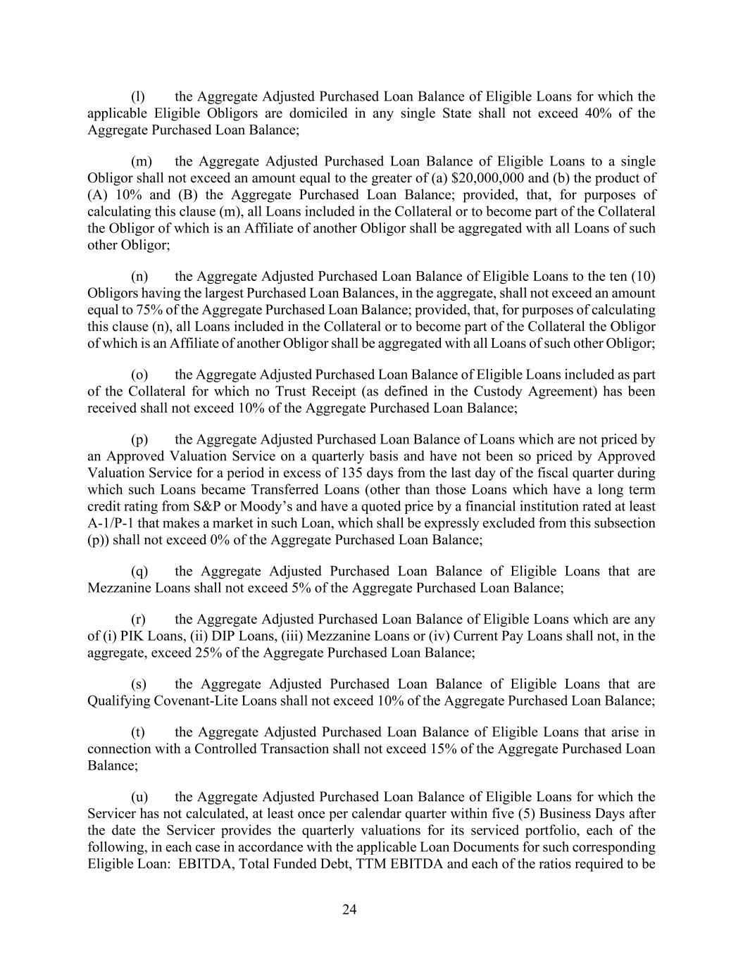 24 (l) the Aggregate Adjusted Purchased Loan Balance of Eligible Loans for which the applicable Eligible Obligors are domiciled in any single State shall not exceed 40% of the Aggregate Purchased Loan Balance; (m) the Aggregate Adjusted Purchased Loan Balance of Eligible Loans to a single Obligor shall not exceed an amount equal to the greater of (a) $20,000,000 and (b) the product of (A) 10% and (B) the Aggregate Purchased Loan Balance; provided, that, for purposes of calculating this clause (m), all Loans included in the Collateral or to become part of the Collateral the Obligor of which is an Affiliate of another Obligor shall be aggregated with all Loans of such other Obligor; (n) the Aggregate Adjusted Purchased Loan Balance of Eligible Loans to the ten (10) Obligors having the largest Purchased Loan Balances, in the aggregate, shall not exceed an amount equal to 75% of the Aggregate Purchased Loan Balance; provided, that, for purposes of calculating this clause (n), all Loans included in the Collateral or to become part of the Collateral the Obligor of which is an Affiliate of another Obligor shall be aggregated with all Loans of such other Obligor; (o) the Aggregate Adjusted Purchased Loan Balance of Eligible Loans included as part of the Collateral for which no Trust Receipt (as defined in the Custody Agreement) has been received shall not exceed 10% of the Aggregate Purchased Loan Balance; (p) the Aggregate Adjusted Purchased Loan Balance of Loans which are not priced by an Approved Valuation Service on a quarterly basis and have not been so priced by Approved Valuation Service for a period in excess of 135 days from the last day of the fiscal quarter during which such Loans became Transferred Loans (other than those Loans which have a long term credit rating from S&P or Moody’s and have a quoted price by a financial institution rated at least A-1/P-1 that makes a market in such Loan, which shall be expressly excluded from this subsection (p)) shall not exceed 0% of the Aggregate Purchased Loan Balance; (q) the Aggregate Adjusted Purchased Loan Balance of Eligible Loans that are Mezzanine Loans shall not exceed 5% of the Aggregate Purchased Loan Balance; (r) the Aggregate Adjusted Purchased Loan Balance of Eligible Loans which are any of (i) PIK Loans, (ii) DIP Loans, (iii) Mezzanine Loans or (iv) Current Pay Loans shall not, in the aggregate, exceed 25% of the Aggregate Purchased Loan Balance; (s) the Aggregate Adjusted Purchased Loan Balance of Eligible Loans that are Qualifying Covenant-Lite Loans shall not exceed 10% of the Aggregate Purchased Loan Balance; (t) the Aggregate Adjusted Purchased Loan Balance of Eligible Loans that arise in connection with a Controlled Transaction shall not exceed 15% of the Aggregate Purchased Loan Balance; (u) the Aggregate Adjusted Purchased Loan Balance of Eligible Loans for which the Servicer has not calculated, at least once per calendar quarter within five (5) Business Days after the date the Servicer provides the quarterly valuations for its serviced portfolio, each of the following, in each case in accordance with the applicable Loan Documents for such corresponding Eligible Loan: EBITDA, Total Funded Debt, TTM EBITDA and each of the ratios required to be