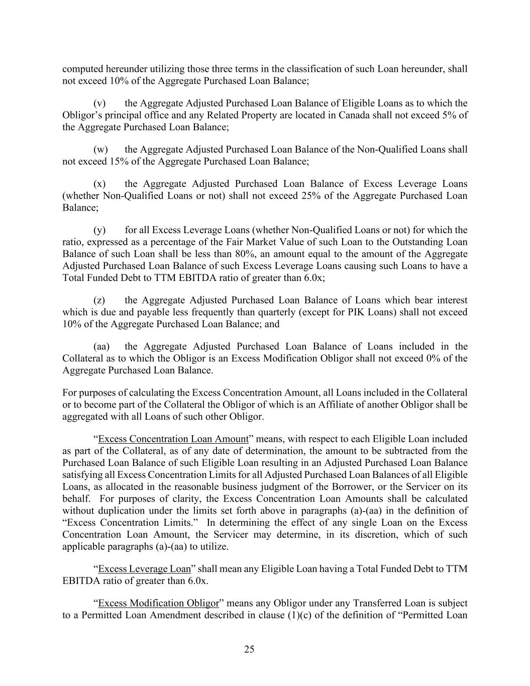 25 computed hereunder utilizing those three terms in the classification of such Loan hereunder, shall not exceed 10% of the Aggregate Purchased Loan Balance; (v) the Aggregate Adjusted Purchased Loan Balance of Eligible Loans as to which the Obligor’s principal office and any Related Property are located in Canada shall not exceed 5% of the Aggregate Purchased Loan Balance; (w) the Aggregate Adjusted Purchased Loan Balance of the Non-Qualified Loans shall not exceed 15% of the Aggregate Purchased Loan Balance; (x) the Aggregate Adjusted Purchased Loan Balance of Excess Leverage Loans (whether Non-Qualified Loans or not) shall not exceed 25% of the Aggregate Purchased Loan Balance; (y) for all Excess Leverage Loans (whether Non-Qualified Loans or not) for which the ratio, expressed as a percentage of the Fair Market Value of such Loan to the Outstanding Loan Balance of such Loan shall be less than 80%, an amount equal to the amount of the Aggregate Adjusted Purchased Loan Balance of such Excess Leverage Loans causing such Loans to have a Total Funded Debt to TTM EBITDA ratio of greater than 6.0x; (z) the Aggregate Adjusted Purchased Loan Balance of Loans which bear interest which is due and payable less frequently than quarterly (except for PIK Loans) shall not exceed 10% of the Aggregate Purchased Loan Balance; and (aa) the Aggregate Adjusted Purchased Loan Balance of Loans included in the Collateral as to which the Obligor is an Excess Modification Obligor shall not exceed 0% of the Aggregate Purchased Loan Balance. For purposes of calculating the Excess Concentration Amount, all Loans included in the Collateral or to become part of the Collateral the Obligor of which is an Affiliate of another Obligor shall be aggregated with all Loans of such other Obligor. “Excess Concentration Loan Amount” means, with respect to each Eligible Loan included as part of the Collateral, as of any date of determination, the amount to be subtracted from the Purchased Loan Balance of such Eligible Loan resulting in an Adjusted Purchased Loan Balance satisfying all Excess Concentration Limits for all Adjusted Purchased Loan Balances of all Eligible Loans, as allocated in the reasonable business judgment of the Borrower, or the Servicer on its behalf. For purposes of clarity, the Excess Concentration Loan Amounts shall be calculated without duplication under the limits set forth above in paragraphs (a)-(aa) in the definition of “Excess Concentration Limits.” In determining the effect of any single Loan on the Excess Concentration Loan Amount, the Servicer may determine, in its discretion, which of such applicable paragraphs (a)-(aa) to utilize. “Excess Leverage Loan” shall mean any Eligible Loan having a Total Funded Debt to TTM EBITDA ratio of greater than 6.0x. “Excess Modification Obligor” means any Obligor under any Transferred Loan is subject to a Permitted Loan Amendment described in clause (1)(c) of the definition of “Permitted Loan