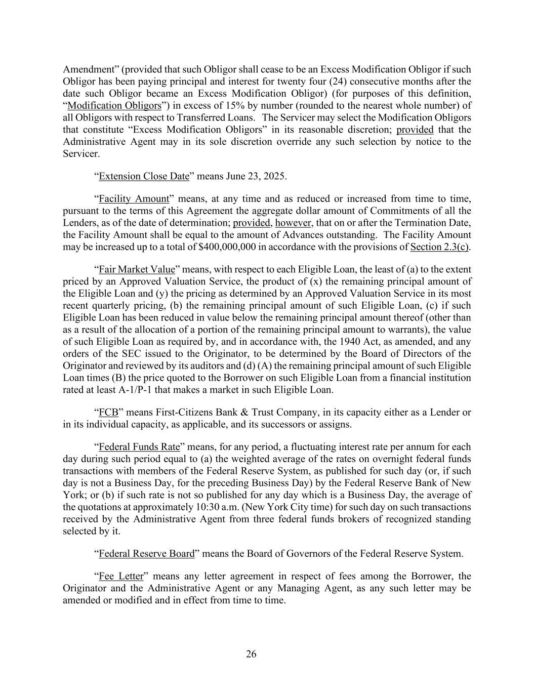 26 Amendment” (provided that such Obligor shall cease to be an Excess Modification Obligor if such Obligor has been paying principal and interest for twenty four (24) consecutive months after the date such Obligor became an Excess Modification Obligor) (for purposes of this definition, “Modification Obligors”) in excess of 15% by number (rounded to the nearest whole number) of all Obligors with respect to Transferred Loans. The Servicer may select the Modification Obligors that constitute “Excess Modification Obligors” in its reasonable discretion; provided that the Administrative Agent may in its sole discretion override any such selection by notice to the Servicer. “Extension Close Date” means June 23, 2025. “Facility Amount” means, at any time and as reduced or increased from time to time, pursuant to the terms of this Agreement the aggregate dollar amount of Commitments of all the Lenders, as of the date of determination; provided, however, that on or after the Termination Date, the Facility Amount shall be equal to the amount of Advances outstanding. The Facility Amount may be increased up to a total of $400,000,000 in accordance with the provisions of Section 2.3(c). “Fair Market Value” means, with respect to each Eligible Loan, the least of (a) to the extent priced by an Approved Valuation Service, the product of (x) the remaining principal amount of the Eligible Loan and (y) the pricing as determined by an Approved Valuation Service in its most recent quarterly pricing, (b) the remaining principal amount of such Eligible Loan, (c) if such Eligible Loan has been reduced in value below the remaining principal amount thereof (other than as a result of the allocation of a portion of the remaining principal amount to warrants), the value of such Eligible Loan as required by, and in accordance with, the 1940 Act, as amended, and any orders of the SEC issued to the Originator, to be determined by the Board of Directors of the Originator and reviewed by its auditors and (d) (A) the remaining principal amount of such Eligible Loan times (B) the price quoted to the Borrower on such Eligible Loan from a financial institution rated at least A-1/P-1 that makes a market in such Eligible Loan. “FCB” means First-Citizens Bank & Trust Company, in its capacity either as a Lender or in its individual capacity, as applicable, and its successors or assigns. “Federal Funds Rate” means, for any period, a fluctuating interest rate per annum for each day during such period equal to (a) the weighted average of the rates on overnight federal funds transactions with members of the Federal Reserve System, as published for such day (or, if such day is not a Business Day, for the preceding Business Day) by the Federal Reserve Bank of New York; or (b) if such rate is not so published for any day which is a Business Day, the average of the quotations at approximately 10:30 a.m. (New York City time) for such day on such transactions received by the Administrative Agent from three federal funds brokers of recognized standing selected by it. “Federal Reserve Board” means the Board of Governors of the Federal Reserve System. “Fee Letter” means any letter agreement in respect of fees among the Borrower, the Originator and the Administrative Agent or any Managing Agent, as any such letter may be amended or modified and in effect from time to time.