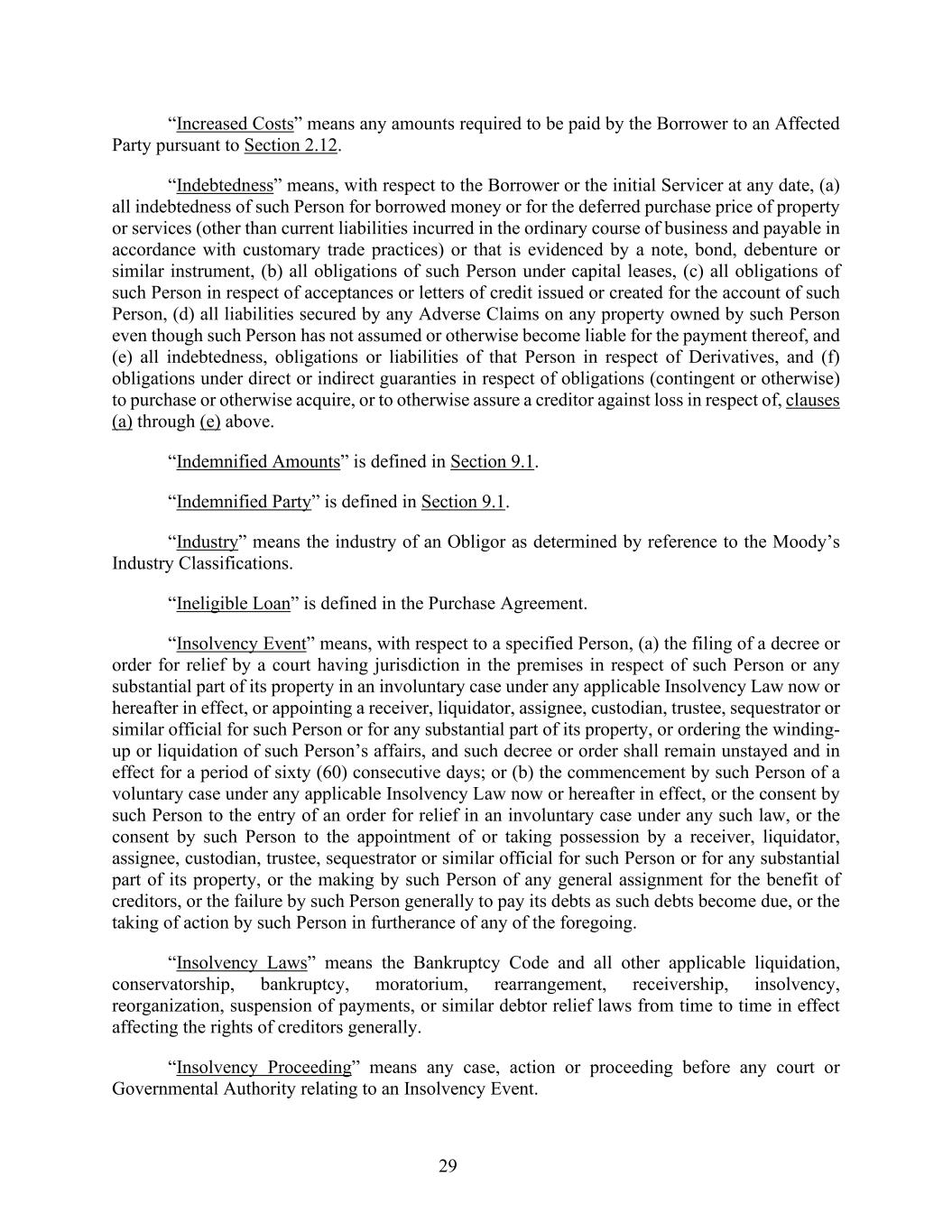 29 “Increased Costs” means any amounts required to be paid by the Borrower to an Affected Party pursuant to Section 2.12. “Indebtedness” means, with respect to the Borrower or the initial Servicer at any date, (a) all indebtedness of such Person for borrowed money or for the deferred purchase price of property or services (other than current liabilities incurred in the ordinary course of business and payable in accordance with customary trade practices) or that is evidenced by a note, bond, debenture or similar instrument, (b) all obligations of such Person under capital leases, (c) all obligations of such Person in respect of acceptances or letters of credit issued or created for the account of such Person, (d) all liabilities secured by any Adverse Claims on any property owned by such Person even though such Person has not assumed or otherwise become liable for the payment thereof, and (e) all indebtedness, obligations or liabilities of that Person in respect of Derivatives, and (f) obligations under direct or indirect guaranties in respect of obligations (contingent or otherwise) to purchase or otherwise acquire, or to otherwise assure a creditor against loss in respect of, clauses (a) through (e) above. “Indemnified Amounts” is defined in Section 9.1. “Indemnified Party” is defined in Section 9.1. “Industry” means the industry of an Obligor as determined by reference to the Moody’s Industry Classifications. “Ineligible Loan” is defined in the Purchase Agreement. “Insolvency Event” means, with respect to a specified Person, (a) the filing of a decree or order for relief by a court having jurisdiction in the premises in respect of such Person or any substantial part of its property in an involuntary case under any applicable Insolvency Law now or hereafter in effect, or appointing a receiver, liquidator, assignee, custodian, trustee, sequestrator or similar official for such Person or for any substantial part of its property, or ordering the winding- up or liquidation of such Person’s affairs, and such decree or order shall remain unstayed and in effect for a period of sixty (60) consecutive days; or (b) the commencement by such Person of a voluntary case under any applicable Insolvency Law now or hereafter in effect, or the consent by such Person to the entry of an order for relief in an involuntary case under any such law, or the consent by such Person to the appointment of or taking possession by a receiver, liquidator, assignee, custodian, trustee, sequestrator or similar official for such Person or for any substantial part of its property, or the making by such Person of any general assignment for the benefit of creditors, or the failure by such Person generally to pay its debts as such debts become due, or the taking of action by such Person in furtherance of any of the foregoing. “Insolvency Laws” means the Bankruptcy Code and all other applicable liquidation, conservatorship, bankruptcy, moratorium, rearrangement, receivership, insolvency, reorganization, suspension of payments, or similar debtor relief laws from time to time in effect affecting the rights of creditors generally. “Insolvency Proceeding” means any case, action or proceeding before any court or Governmental Authority relating to an Insolvency Event.