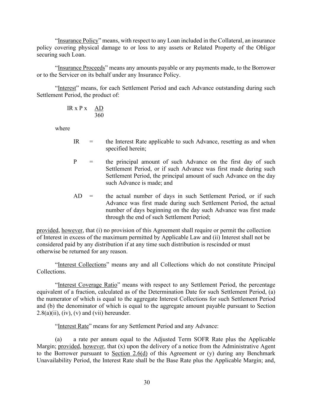 30 “Insurance Policy” means, with respect to any Loan included in the Collateral, an insurance policy covering physical damage to or loss to any assets or Related Property of the Obligor securing such Loan. “Insurance Proceeds” means any amounts payable or any payments made, to the Borrower or to the Servicer on its behalf under any Insurance Policy. “Interest” means, for each Settlement Period and each Advance outstanding during such Settlement Period, the product of: IR x P x AD 360 where IR = the Interest Rate applicable to such Advance, resetting as and when specified herein; P = the principal amount of such Advance on the first day of such Settlement Period, or if such Advance was first made during such Settlement Period, the principal amount of such Advance on the day such Advance is made; and AD = the actual number of days in such Settlement Period, or if such Advance was first made during such Settlement Period, the actual number of days beginning on the day such Advance was first made through the end of such Settlement Period; provided, however, that (i) no provision of this Agreement shall require or permit the collection of Interest in excess of the maximum permitted by Applicable Law and (ii) Interest shall not be considered paid by any distribution if at any time such distribution is rescinded or must otherwise be returned for any reason. “Interest Collections” means any and all Collections which do not constitute Principal Collections. “Interest Coverage Ratio” means with respect to any Settlement Period, the percentage equivalent of a fraction, calculated as of the Determination Date for such Settlement Period, (a) the numerator of which is equal to the aggregate Interest Collections for such Settlement Period and (b) the denominator of which is equal to the aggregate amount payable pursuant to Section 2.8(a)(ii), (iv), (v) and (vii) hereunder. “Interest Rate” means for any Settlement Period and any Advance: (a) a rate per annum equal to the Adjusted Term SOFR Rate plus the Applicable Margin; provided, however, that (x) upon the delivery of a notice from the Administrative Agent to the Borrower pursuant to Section 2.6(d) of this Agreement or (y) during any Benchmark Unavailability Period, the Interest Rate shall be the Base Rate plus the Applicable Margin; and,